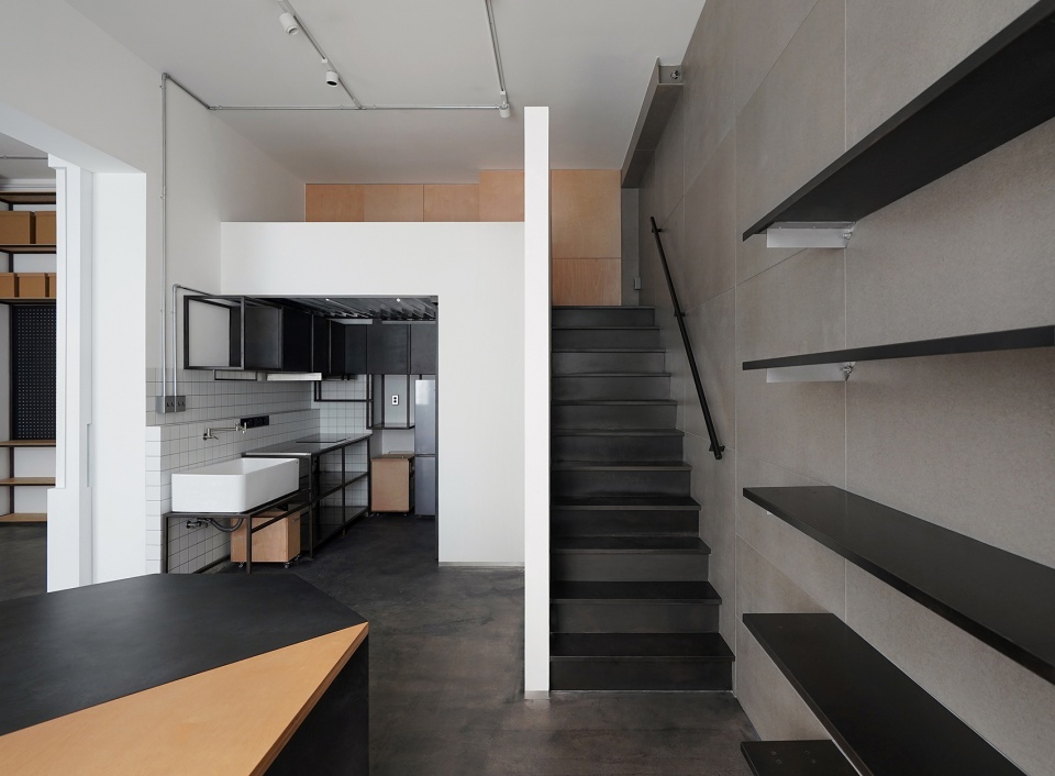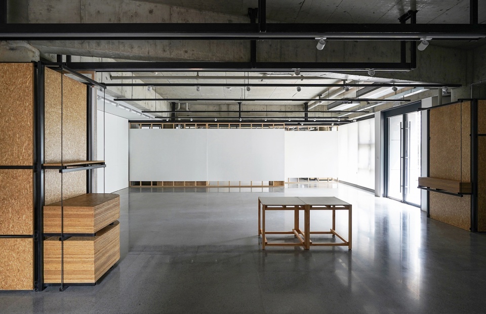 Day-and-night honeycomb blinds regulate the light environment through vertical movement. Combined with horizontally sliding frame, they address natural ventilation, privacy, and light control. A custom-designed table fabricated from hot-rolled steel and birch plywood transitions seamlessly between work surface, dining table, and meeting area.