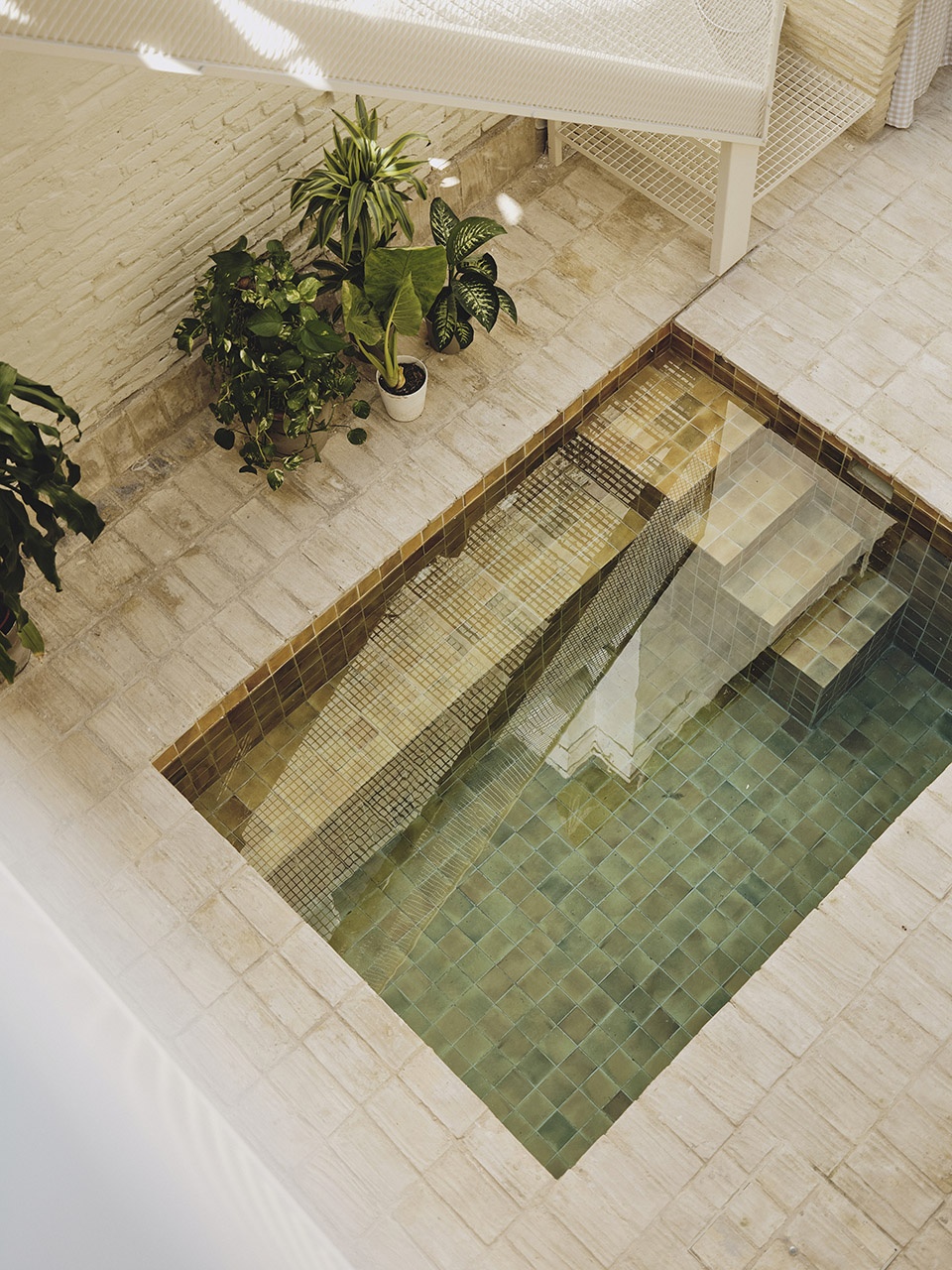 这些烧制陶砖与浴室、厨房、泳池及踢脚线所用的釉面陶砖形成对话,丰富了空间的材料与感知层次。黄色用于湿区,与水交融,呈现出类似瓦伦西亚农田灌溉水塘的绿色调;绿色釉面则用于踢脚线,使这一细部得到强调,并呼应原有同色基座的记忆。