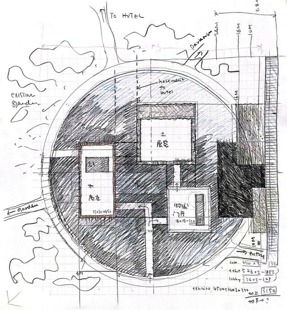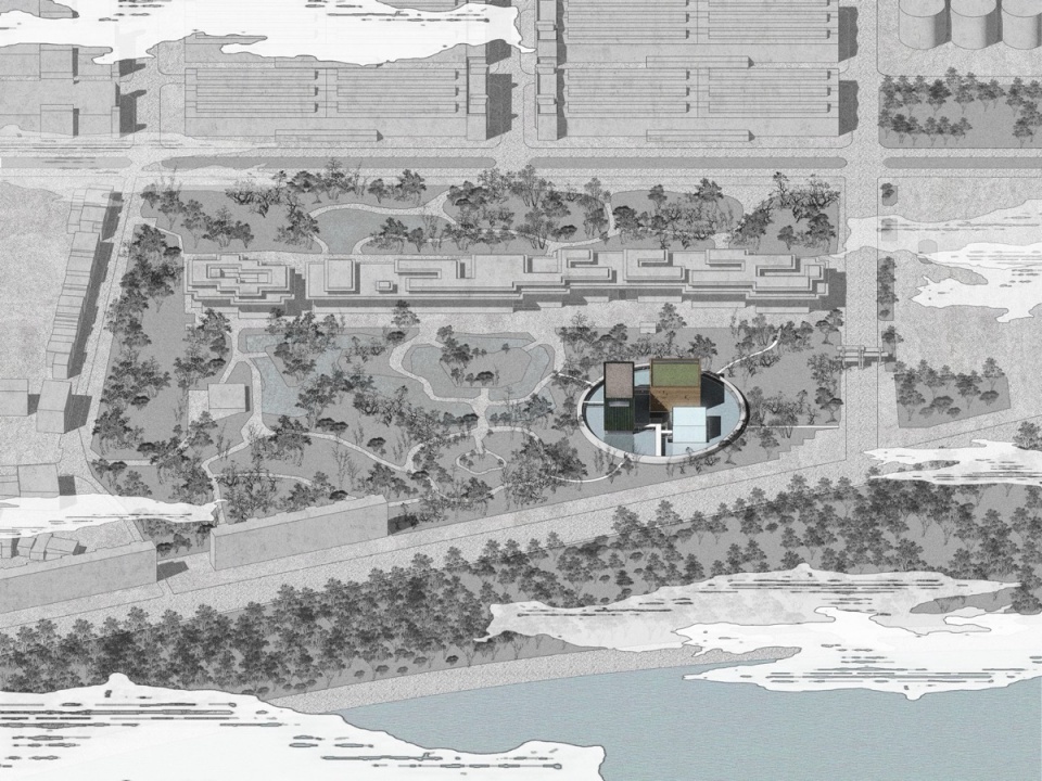 A 90-meter-diameter circular pond is inserted into the existing garden and encircled by a visually semi-transparent covered walkway. Within the water, quiet gushing springs and plasma misting devices active the surface. The circle, without corners, integrating seamlessly with the existing landscape while staging a serene, poetic precinct for the architecture of the new museum.