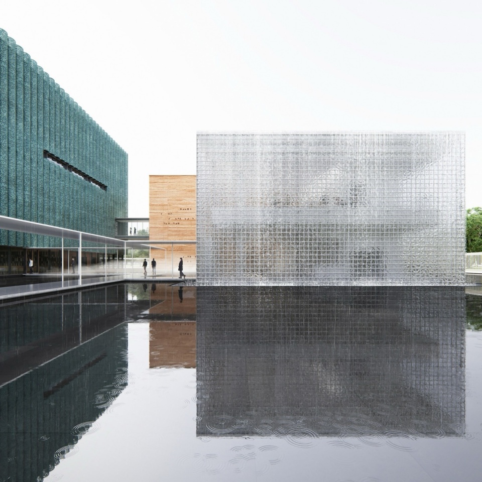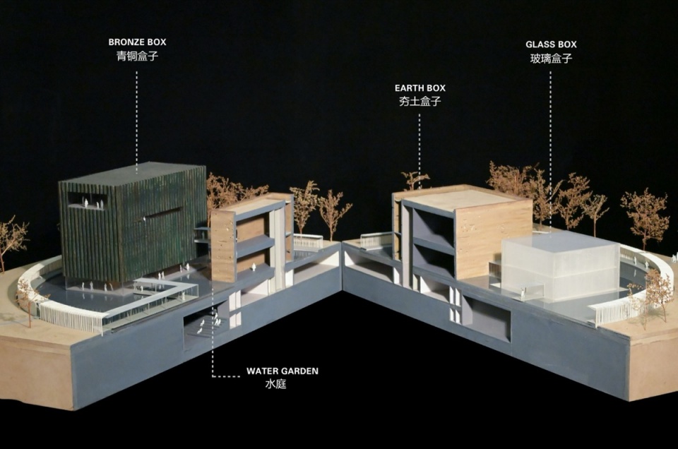 水中浮出三个看似独立的建筑体量:青铜、夯土和玻璃盒子。三个体量又分别跟水面有着不同的关系:一个浮在水上,一个坐在池中,一个嵌入水中上下各一半。半透明的玻璃盒子被安静的流水通体覆盖,水从屋顶流下,顺着四周的玻璃表面一直落到地下二层,往复循环。