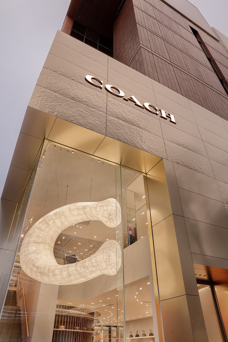 The store is designed to highlight Coach’s new iconic “C” emblem. The exterior adopts a bold graphic expression, translating the brand symbol into an architectural language that reinforces its presence within the Ginza cityscape. The façade is clad in textured metal, subtly recalling the tactile quality of Coach’s signature leather. At the corner, a dramatic glass cut-out offers a glimpse into the interior, revealing the floating brand icon as a central focal point that captures attention from the street.