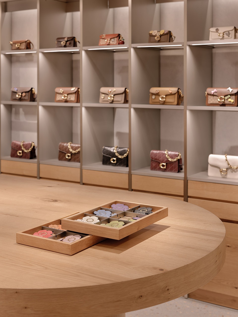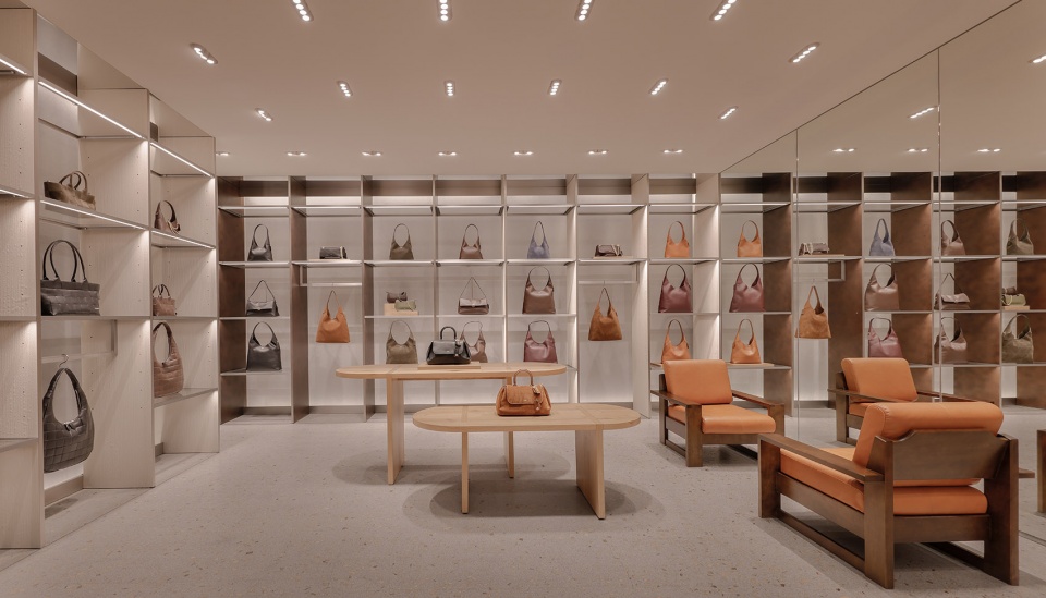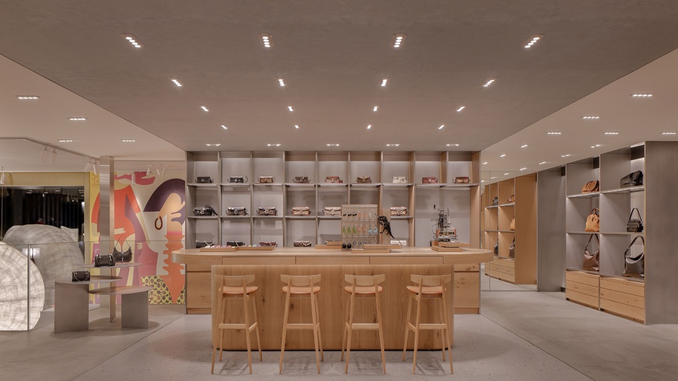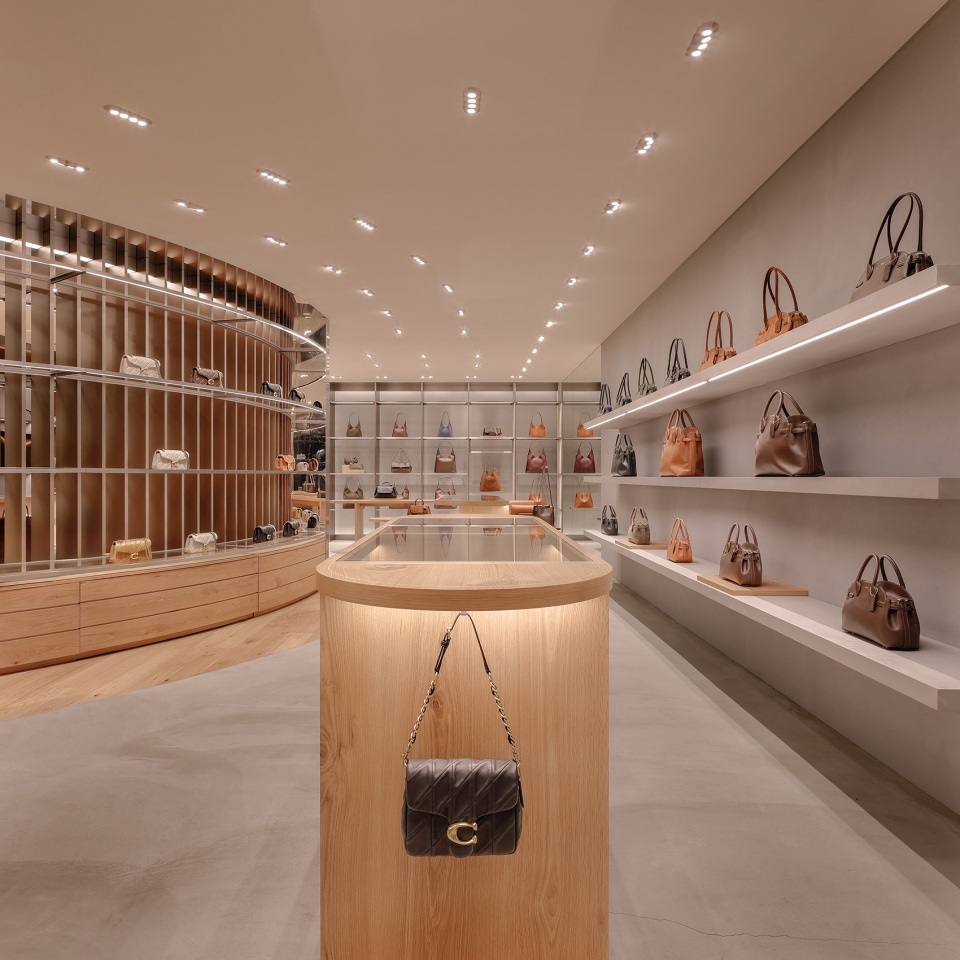 室内空间融入了品牌发源地纽约的精神气质。建筑元素的垂直节奏呼应城市的现代主义特征,映射其标志性的天际线与高密度城市形态。顾客步入店内,便沉浸于Coach的品牌世界之中,被其经典手袋所环绕。