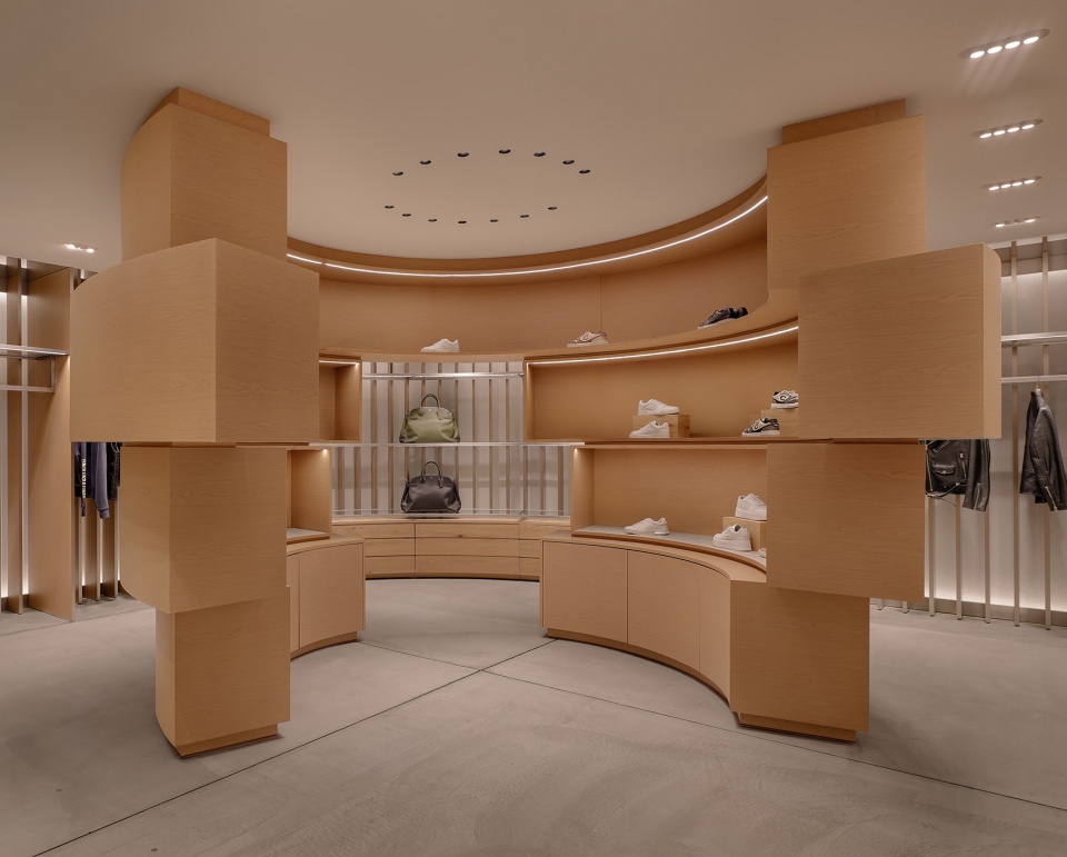 Men’s items are presented within a monumental, cocoon-like shelving structure. This enveloping form creates an intimate, almost secluded environment, allowing customers to step back from the main flow and experience a more focused, contemplative approach to selection.