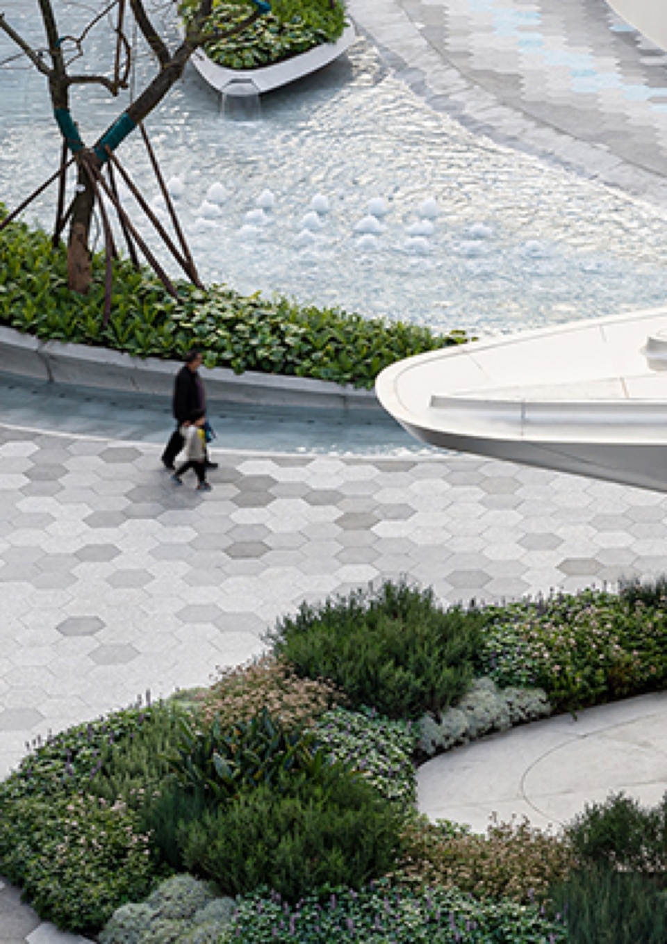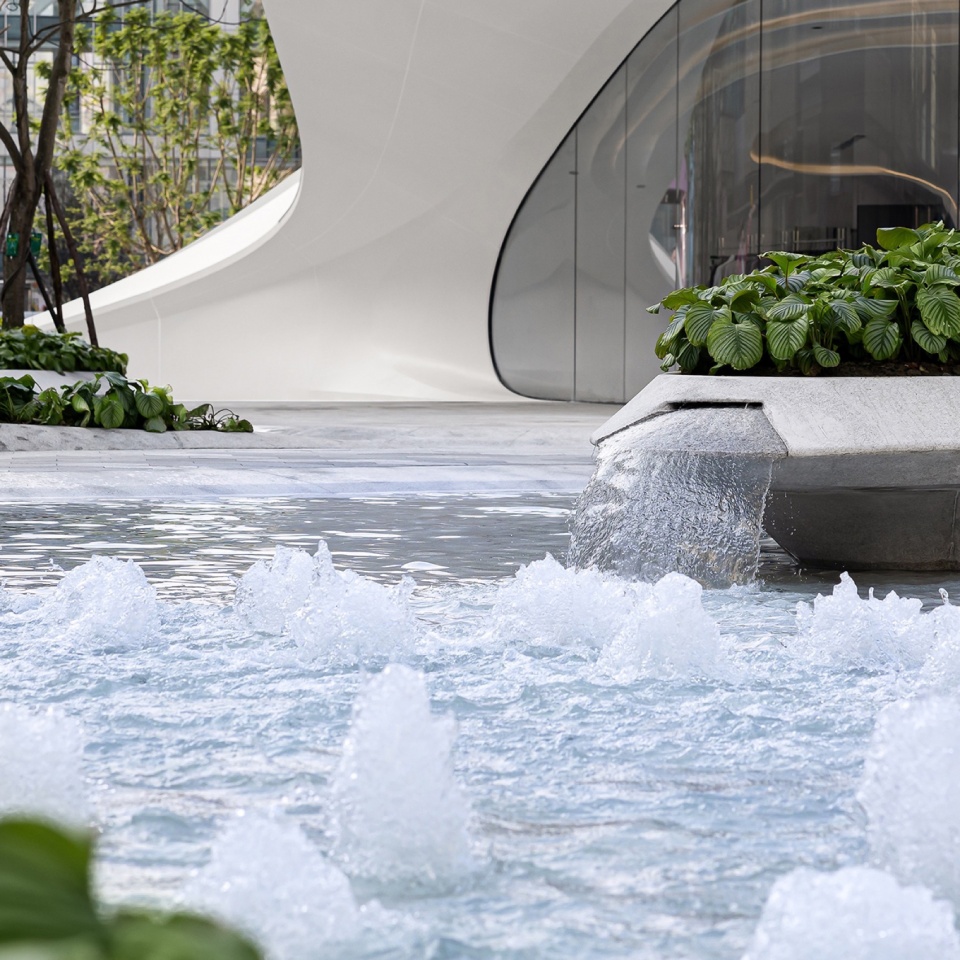设计团队在扎哈曲线的艺术性之上增加了丰富的场景质感,刻意地对景观设计元素进行策略性的“增噪”处理,从而加强公共空间的“摩擦力”。我们通过对铺装、植物、水景以及灯光等系统性的增噪设计理念应用,赋予了作为广场的公共空间更加放松的漫生活气息。