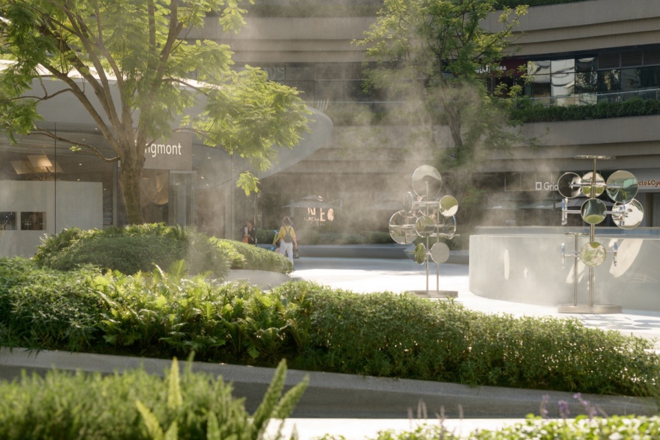 我们遵循“强休憩、重观赏”和“强互动、重参与”两大分类策略,因地制宜置入丰富的多模式水效,其中包含点状珍珠泉、雾森、重力互动水景、矮涌泉等八种缤纷多彩的互动模式。水景的设计由上海亿泽机电设计事务所与FLO团队合作设计完成,最终的场景呈现不仅为人们提供了亲水互动的机会,也作为了艺术展演的“活背景”。