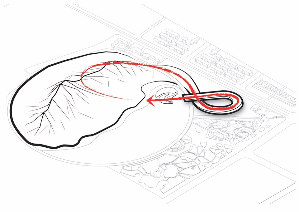Visitors descending from Lion Mountain can step directly onto the museum’s fully planted roof, where curving paths mirror the park below. As the roof rises, the landscape gradually shifts from planting beds to photovoltaic panels, expressing a transition from natural systems to technological innovation.