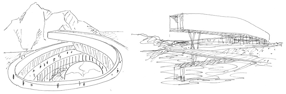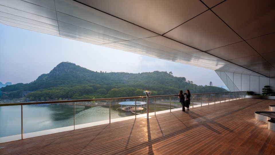 The design is inspired by Suzhou’s history of silk production. The museum gracefully traces the lake’s edge, rises from the landscape, and folds back on itself like a silk sash. Supported by oversized mushroom columns, the building hovers above shaded public space, allowing visitors to move freely between water, gardens, and pathways, and surrounds a sunken courtyard of additional gardens and reflective pools. It then extends outward in a dramatic cantilever toward Lion Mountain, visually linking the building to its natural setting.