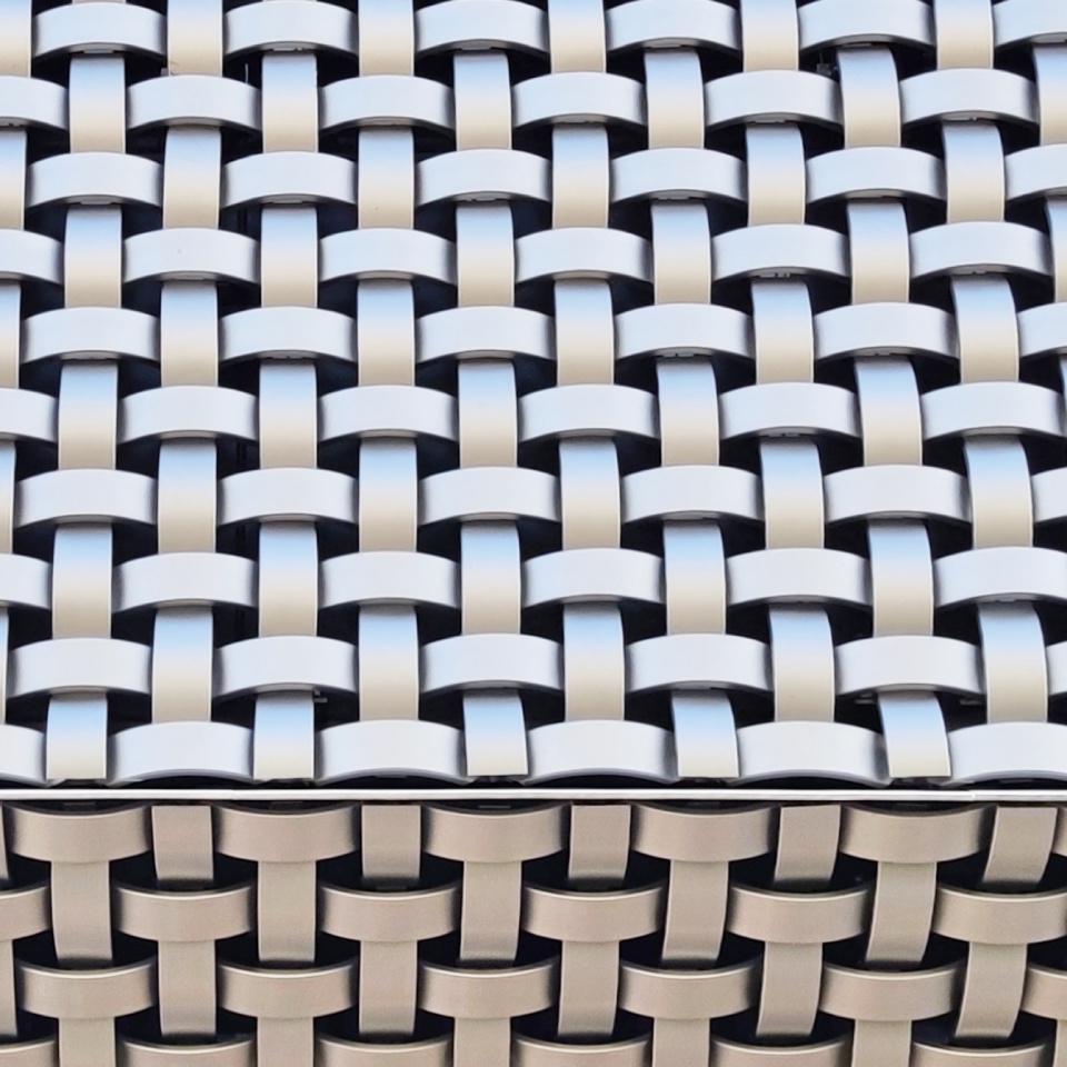 ▼立面系统采用定制化编织铝板,a custom cladding system of convex aluminum panels repeats in a crisscross pattern