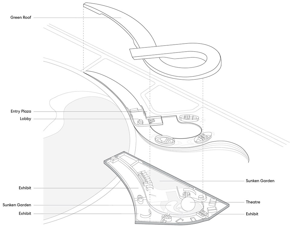 在地面层,雨水花园在场地径流汇入湖泊前进行收集与过滤;树木与植被构建起与周边道路及交通枢纽间的生态缓冲带。科技馆内部采用连续的环形流线组织展陈,借助自然光与向外延展的通透视野,引领访客徜徉于展厅之中。大量功能空间被置于地下景观之中,借助土壤的热稳定性优化建筑的环境性能,同时保持整体形象的开放与通透。