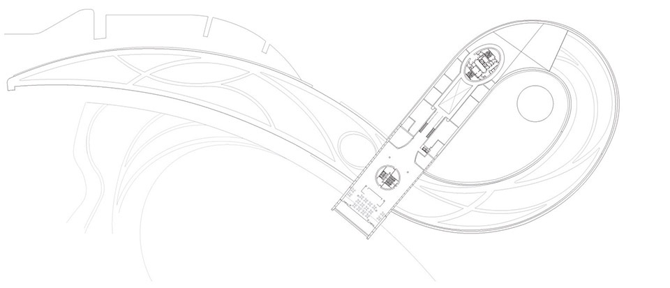 建筑设计灵感源自苏州悠久的丝绸生产历史。科技馆优雅地顺应湖岸曲线,从场地中缓缓升起并回旋成型,宛若一条丝带在空中舒展飘动。建筑由超大尺度的“蘑菇柱”支撑,主体仿佛漂浮于林荫覆盖的公共空间之上,使人们能够在水岸、花园与步道之间恣意穿行。建筑围合出一方下沉庭院,多个生态绿岛与倒影池交融其间。悬臂以如虹之势探向狮山,在视觉上将建筑与自然紧密相连。