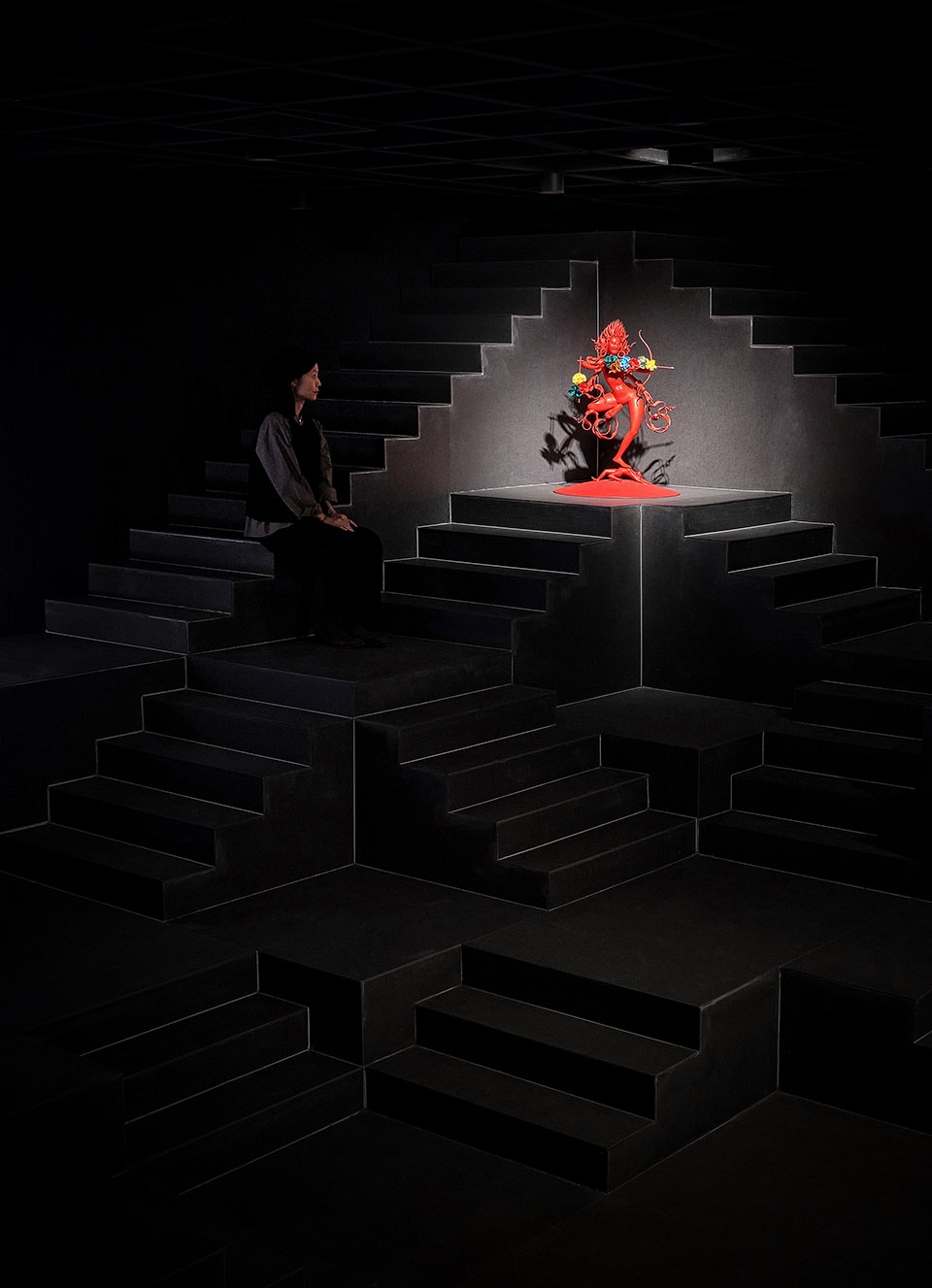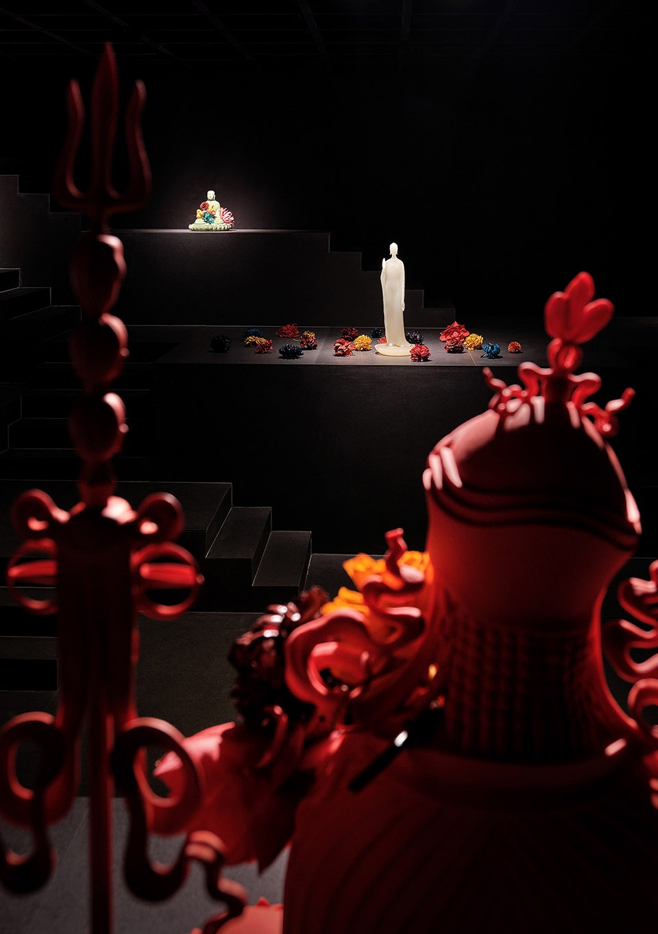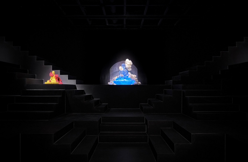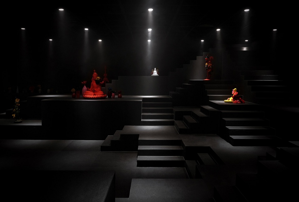 受印度阶梯水舍的启发,我们决定抛弃色彩属性,去除装饰性元素,用简单的几何形状在场地中搭建出层叠的秩序感——一个戏剧般的,只拥有起伏地形与空气的“空房间”。矩阵式的台地由132个1米x1米的立方单元叠组成。我们充分利用场馆高度,将空间尽头处的台阶延伸至了几乎触碰到的天花的位置。在空间构成上,我们并没有设置任何硬性隔断,展品可自由放置于台地之上,并通过灯光的明度深浅与放置佛像的点位对观众进行“柔性”的指引。观众在高低起伏的地形之上自由行走时,与展品的关系时近时远,时而与展品平视,时而会发觉展品在高处。所以真正决定观展路线的是观众的偏好。