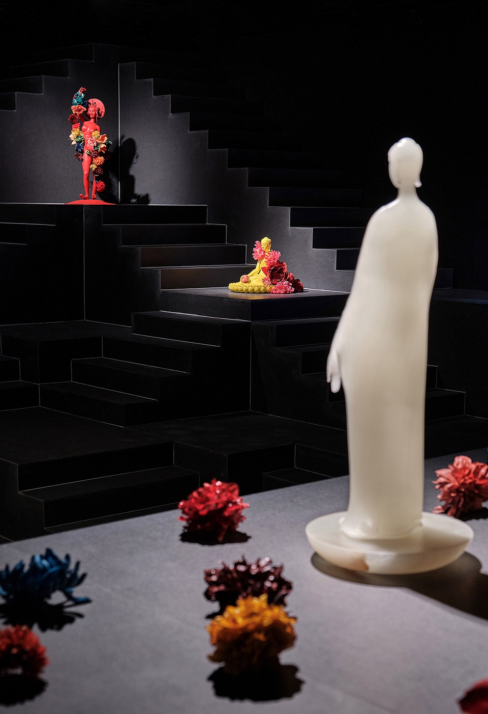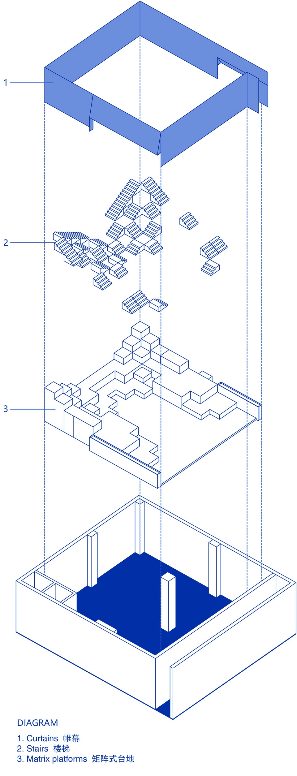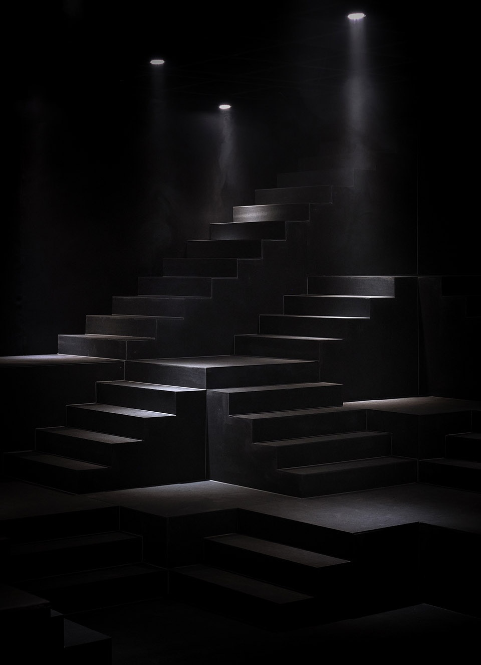 受印度阶梯水舍的启发,我们决定抛弃色彩属性,去除装饰性元素,用简单的几何形状在场地中搭建出层叠的秩序感——一个戏剧般的,只拥有起伏地形与空气的“空房间”。矩阵式的台地由132个1米x1米的立方单元叠组成。我们充分利用场馆高度,将空间尽头处的台阶延伸至了几乎触碰到的天花的位置。在空间构成上,我们并没有设置任何硬性隔断,展品可自由放置于台地之上,并通过灯光的明度深浅与放置佛像的点位对观众进行“柔性”的指引。观众在高低起伏的地形之上自由行走时,与展品的关系时近时远,时而与展品平视,时而会发觉展品在高处。所以真正决定观展路线的是观众的偏好。