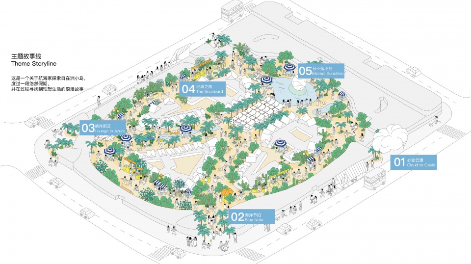 故事线策划以“你想要什么样的生活?”这一命题引入,我们将场地构想为一座未标于地图的神秘岛屿,讲述一位航海家追随天际一朵奇云、抵达岛屿、在探索与闲适中重获生活力,并最终找到理想生活答案的旅程。装置设计串联起“昭示-登陆-奇遇-欢聚”等叙事章节,同时承载门户标志、遮阳休憩与微气候调节等复合功能。整体策划和设计的核心,是向所有人发出一份轻柔而有力的邀请:“来做一场梦,找回生活力。门户装置云,正是这份邀请的封章,也标记着一段关于理想生活的空间叙事就此开启。