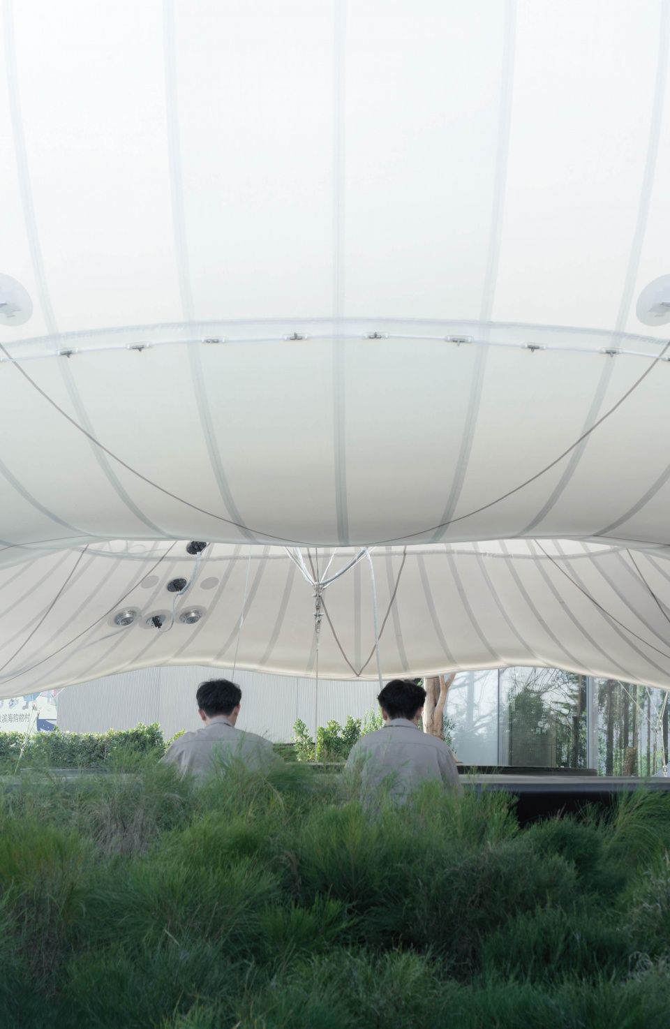 在实施过程中,项目经历了多轮技术推敲。在工程师测算基础上,通过大量样品制作与工厂 1:1 实体打样,对膜材性能、表面纹样、喷雾布置、拉袢结构等关键细节进行反复验证,并针对水管与喷雾头的固定方式进行专项设计,确保其在膜材表面既稳定可靠,也保持整体的视觉完整性。