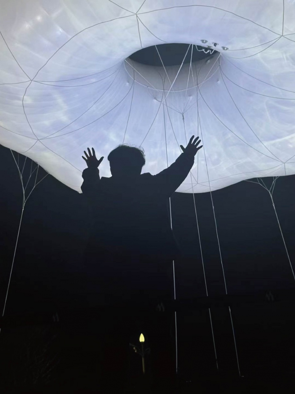 装置轻盈、感性的外观,离不开其内部协同运作的综合系统。为适应场地昼夜温差,装置通过实时气压监测,动态调节空气与氦气比例,在一天中反复吸气与放气,以维持气膜形态的稳定与饱满。