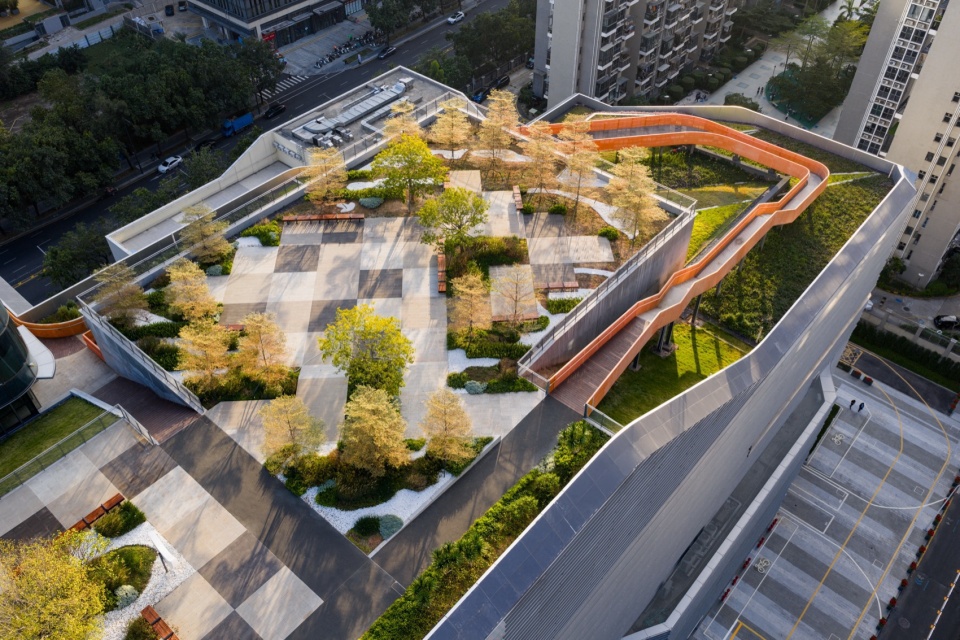 一条如艺术装置般蜿蜒跃动的橙色休闲路径串联起不同标高的景观节点与休憩平台。它不仅是链接不同标高场所的活力飘带,从城市视角中也成为安托山片区内一个充满活力和公众辨识度的视觉地标。