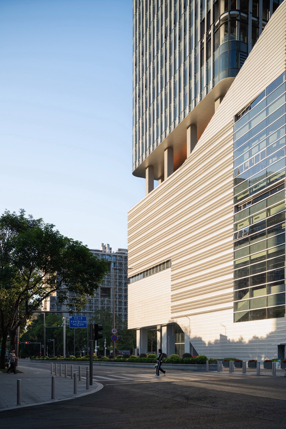 塔楼则通过强化竖向线条与通透的玻璃幕墙,呈现如林木般向上生长的轻盈姿态。它仿佛从“山体”中自然生长而出,不仅象征着面向未来的开放姿态,更在视觉上强化了建筑向天空延伸的动势,与周边自然绿意,天空与城市肌理相互映照。