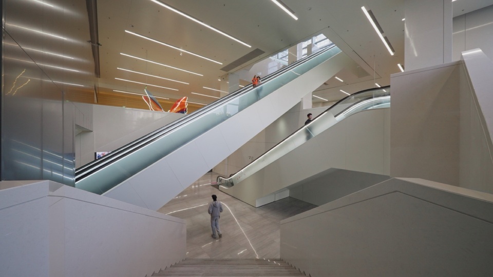 除了宏大的观演空间,项目内还植入了可承载持续性文化艺术活动的展览馆与图书馆。这些空间并非附属,而是构成“立体文化生态系统”的公共节点。展览馆位于裙房六、七层,采用了开放式布局,展览区域局部通高两层,为大型装置艺术、综合媒介展览提供灵活性的容器。