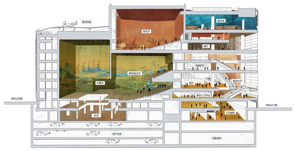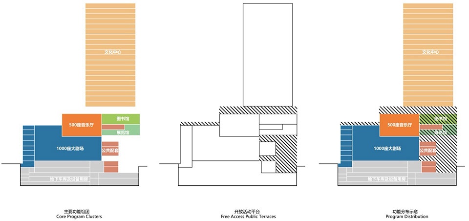 The project’s core challenge lies in negotiating and integrating extreme site constraints with the demand for highly efficient public space. Within a site of approximately one hectare, it accommodates a gross floor area exceeding 100,000 sqm. Through systematic vertical integration, programmatic elements—including a grand theatre, concert hall, black box theatres, library, and exhibition halls—are volumetrically stacked to form a compact, high-performance vertical cultural cluster.