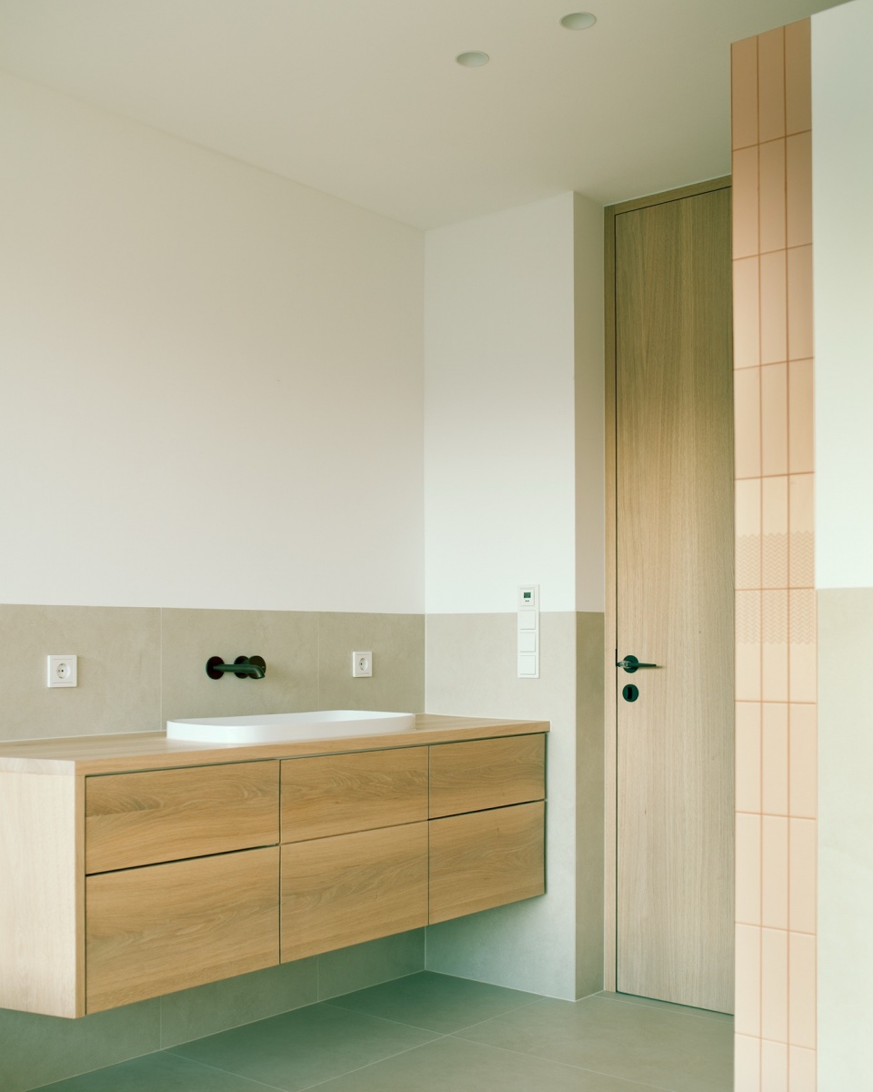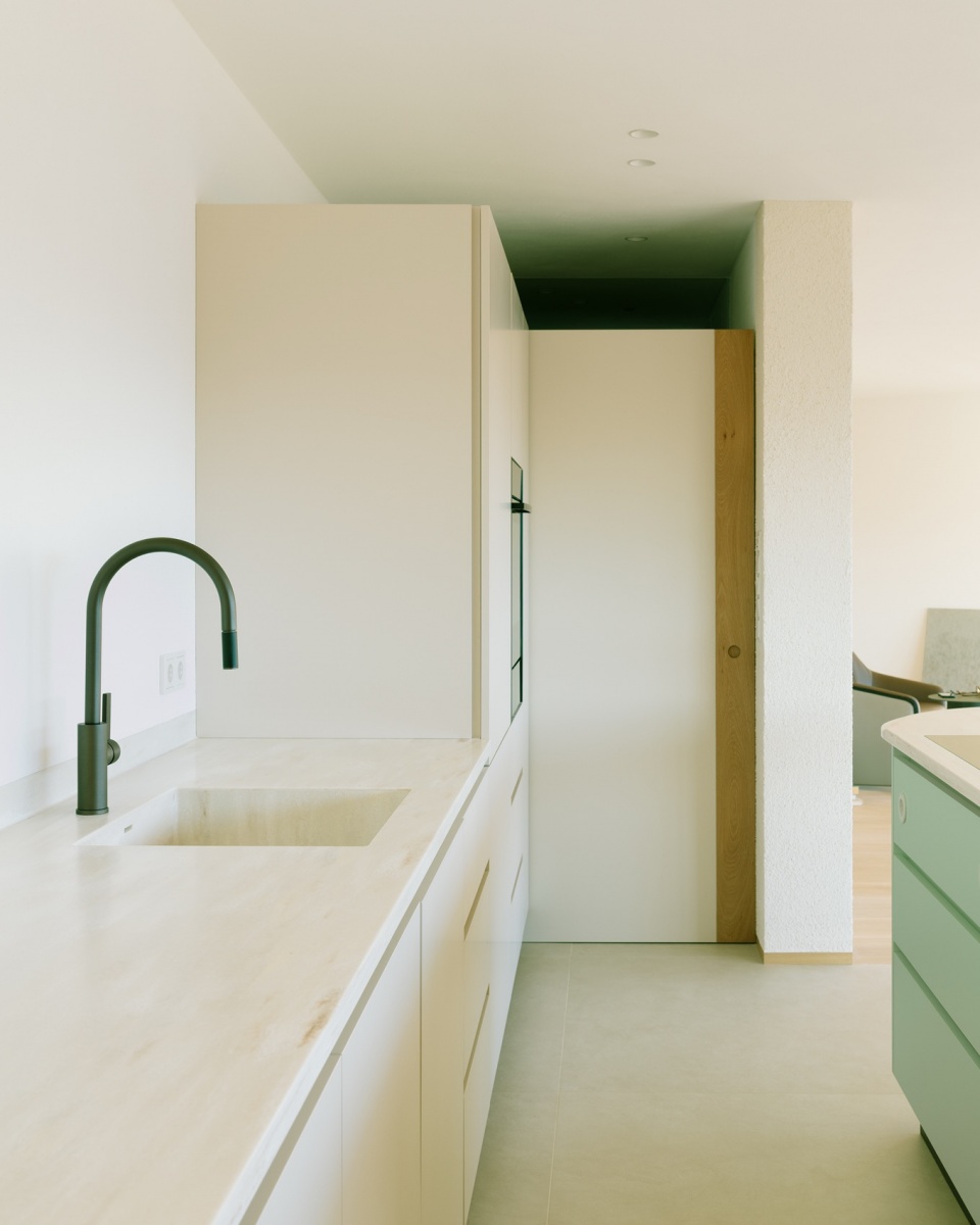 Exposed concrete, natural stone masonry, and glass define the building’s external appearance. Internally, rough plaster tinted with local stone aggregates, together with the use of chestnut and oak for flooring, ceilings, doors, and built-in furnishings, contrasts with the smooth plastered walls, tiled surfaces, and monochrome furniture fronts.
