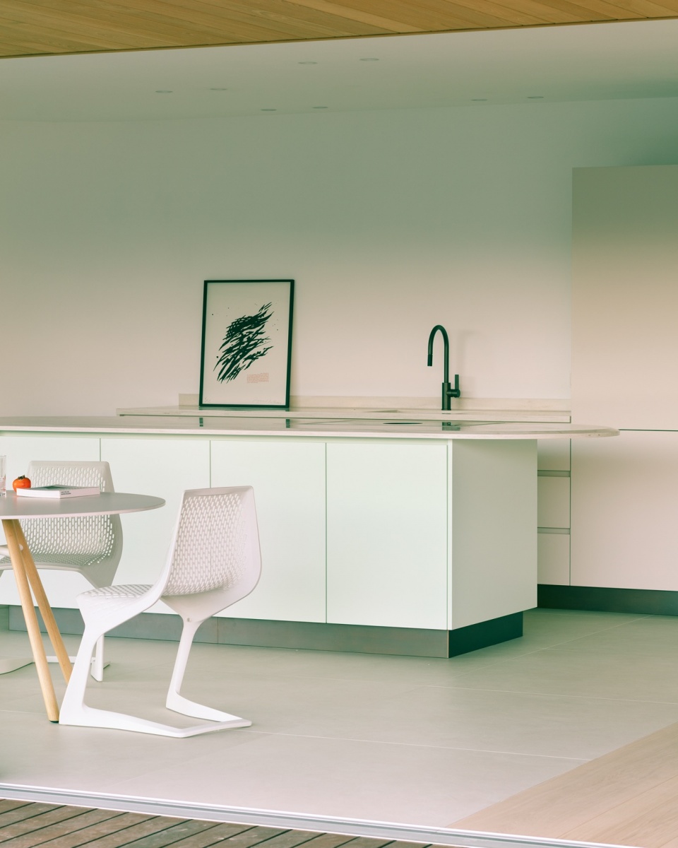 顺应自然坡度,这一单层体量向南和东南方向展开。新增单元由一个位于中心的起居空间及其一体化厨房组成,两侧分别布置卧室和卫生间。