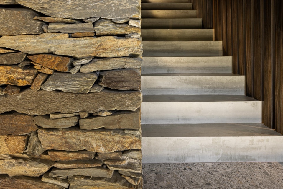 由此,一个核心概念逐渐成形:对传统山地住宅的当代重释。设计在保留原有建筑精神的基础上,以当地标志性的片岩(schist)重新构筑结构,并引入一种克制而清晰的当代建筑语言。项目以极为节制的材料体系,通过一次明确而有力的建筑介入,标记出这一新阶段的时间层次,同时尊重场地与建筑所积累的历史痕迹。
