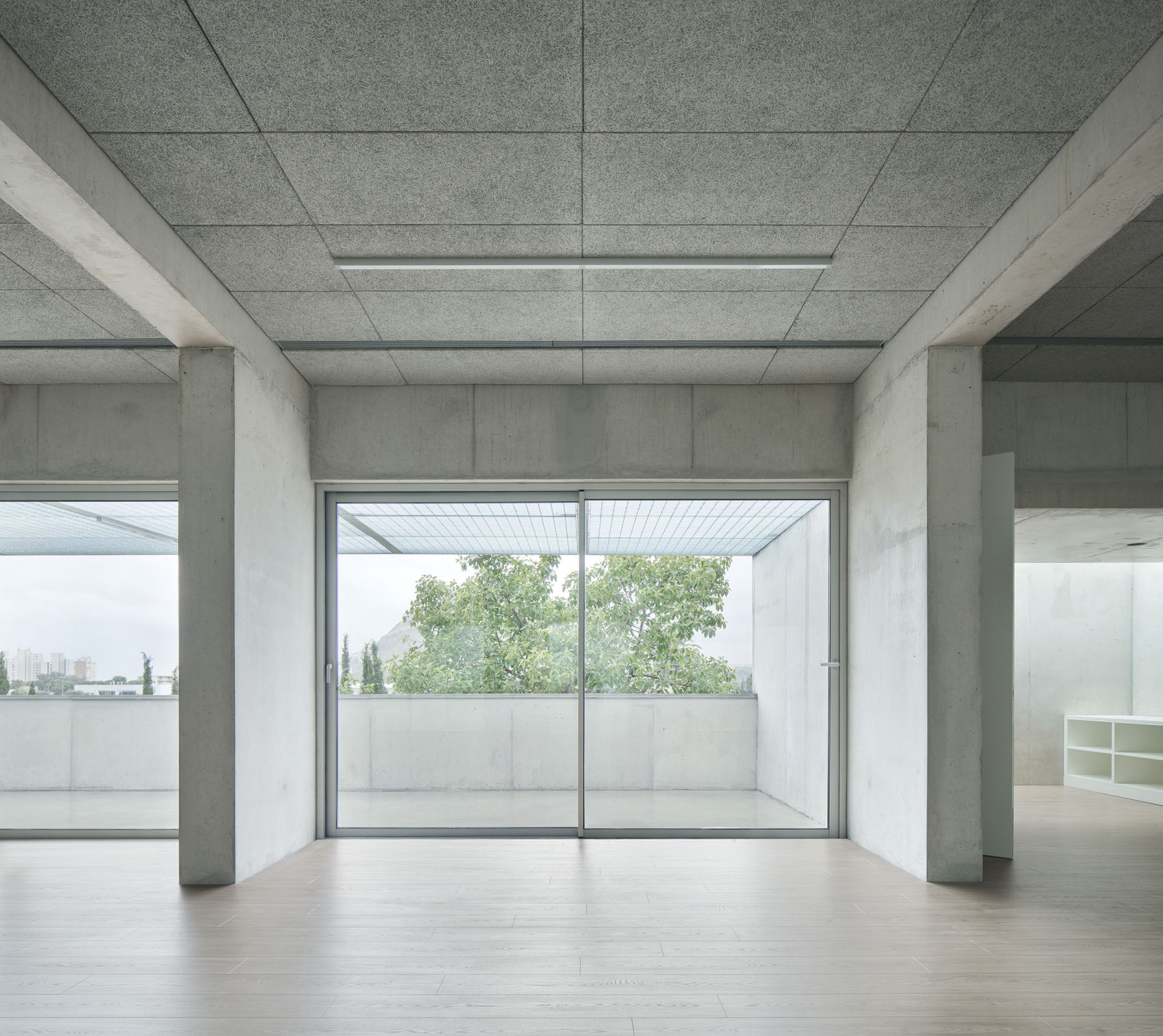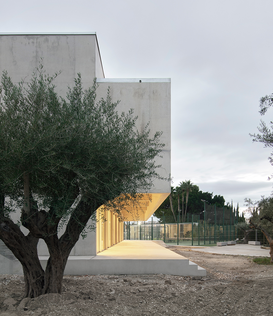 The new spaces open toward the distant landscape of the Alicante huerta, establishing a visual connection with the surroundings. The south façade is conceived as a deep envelope that filters direct solar radiation, creating a porch at ground level and a terrace on the first floor, which extend the interior spaces outward and reinforce the relationship with the environment and the landscape. The extension introduces a new main entrance and a central atrium that organizes arrival, circulation, and the connection between the existing and new spaces, while also providing natural lighting and ventilation. The atrium creates a tempered atmosphere and acts as a reference element, improving orientation, accessibility, and the overall user experience.