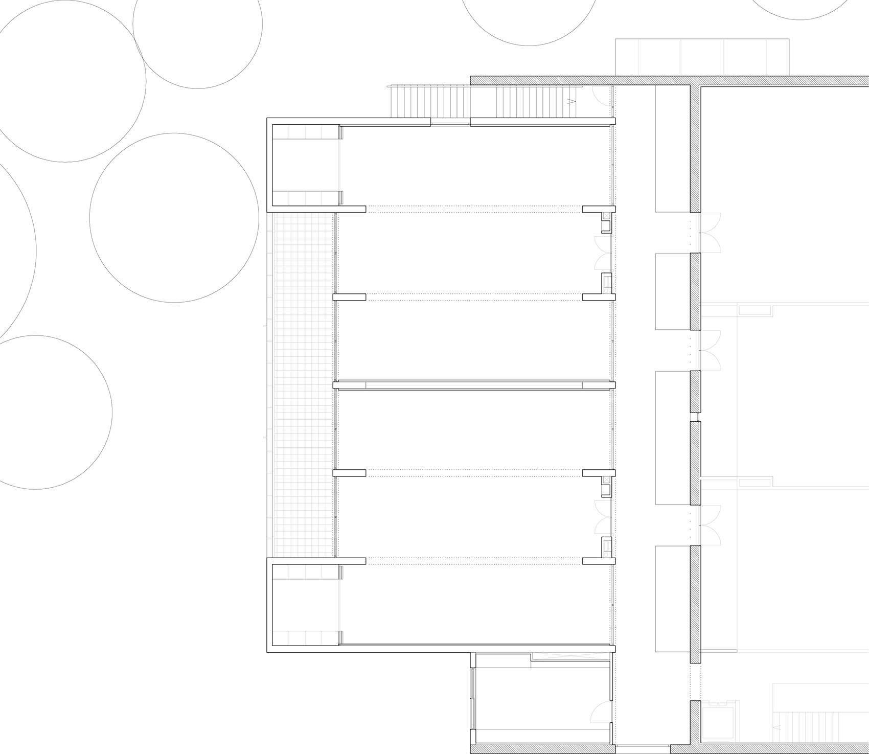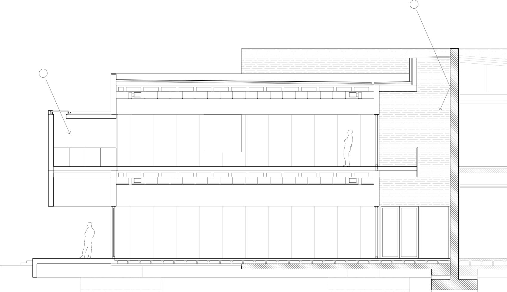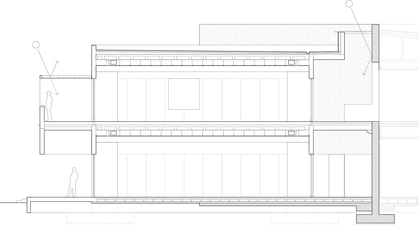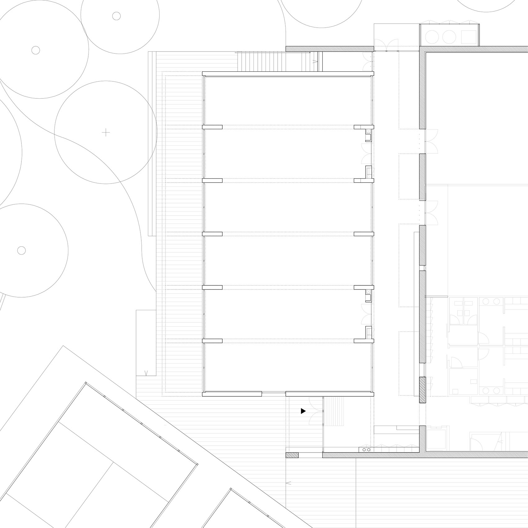 建筑介入包括通过占用现有壁球场中的第二个空间,对一座多功能体育建筑进行扩建,从而完成由原有混凝土墙体所界定的H形几何结构。项目对这一既有结构进行修复与强化,在新建部分中采用相同材料,以确保建筑的一体化与连续性,同时保留其记忆。