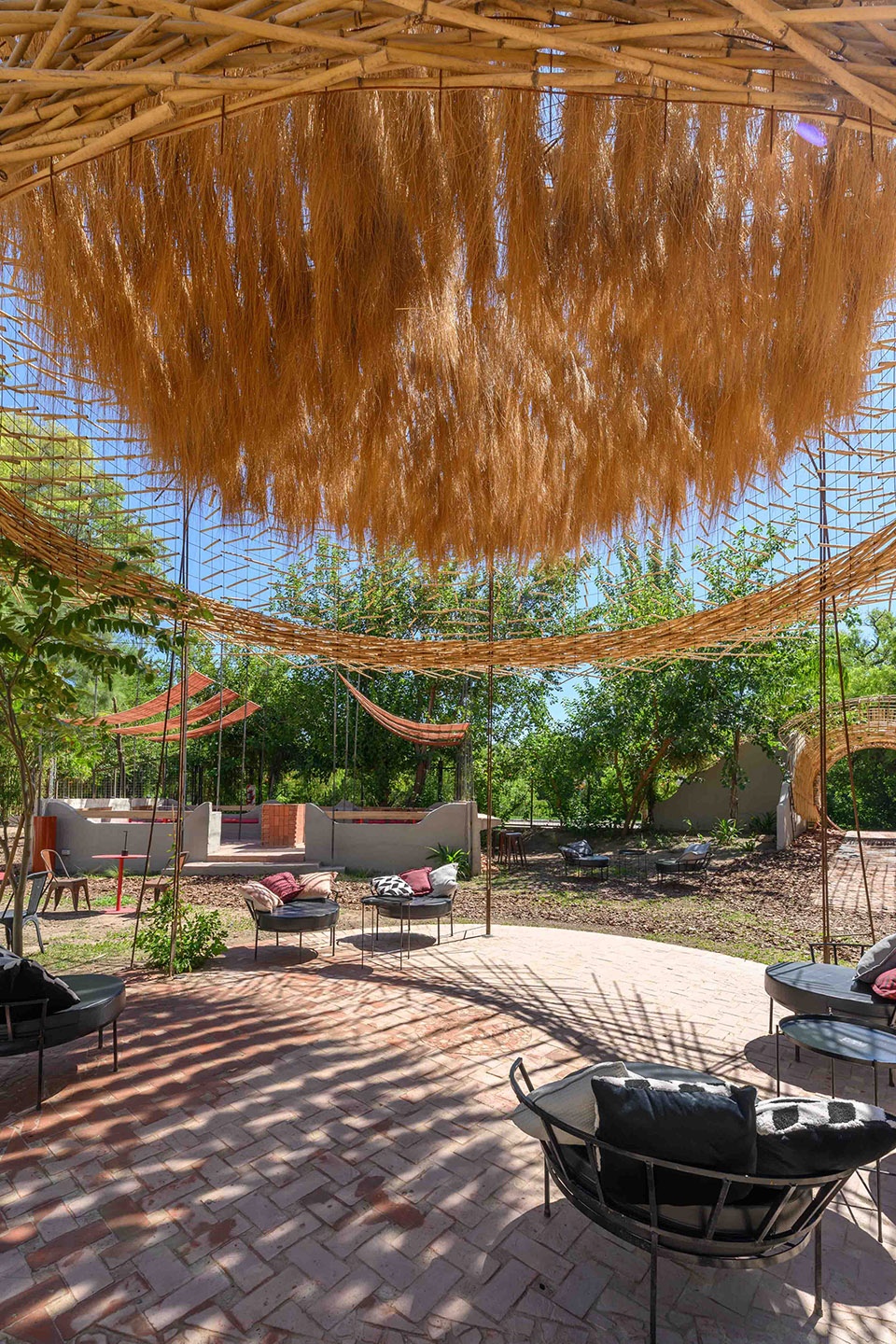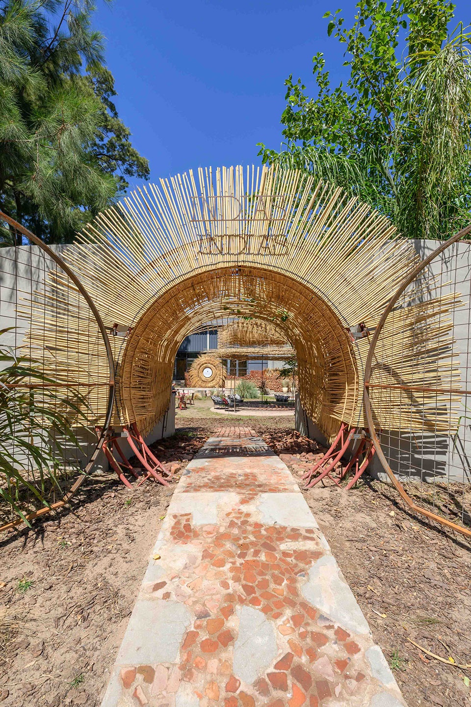 A vaulted tunnel made of bamboo cane rods recovered during the initial site clearing crowns the entrance with a lightweight structure of strong structural and material expressiveness. Repetition produces shade and vibration, compressing the passage and regulating the transition between exterior and interior, preparing the body for a shared experience.
