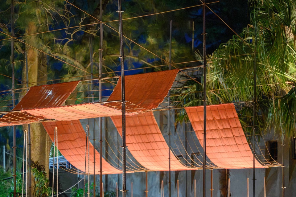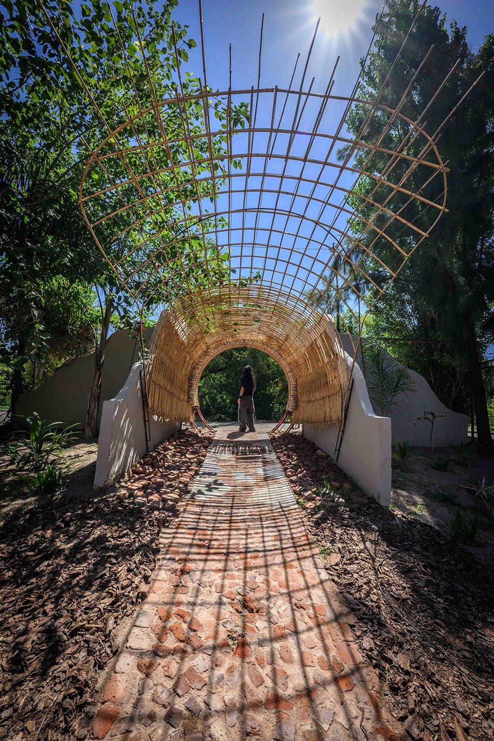入口处由一条拱形通道构成,其结构由场地初期清理过程中回收的竹竿搭建而成,形成轻盈却富有结构与材料表现力的覆盖体系。重复构成阴影与振动感,压缩通行尺度,并调节室内外之间的过渡,为身体进入共享体验做好准备。