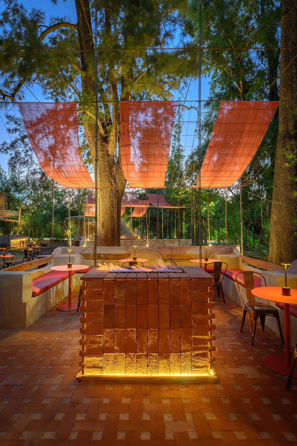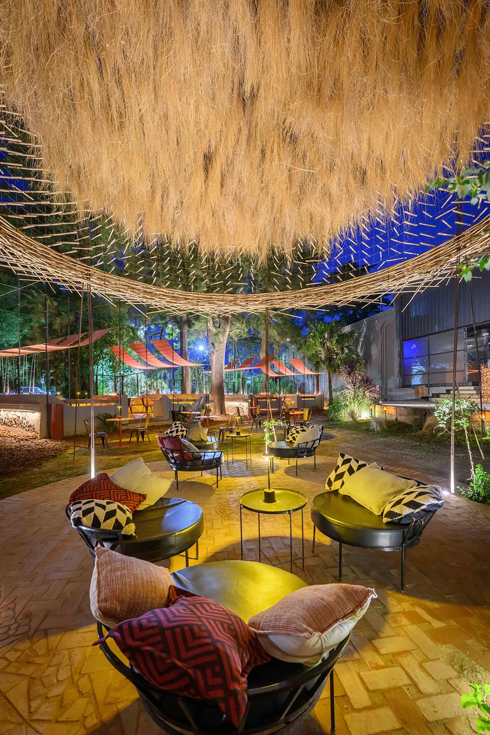 夜间照明来自温暖、低位、间接的向上光源,唤起围火而聚的意象,营造出亲密而富有仪式感的氛围。光并不追求均质,而是在空间中振动、投射阴影,并强化编织结构的材料质感。
