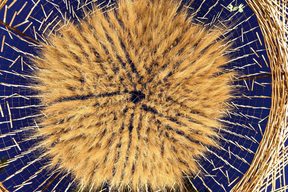 A symbol of encounter that reinforces the communal dimension of the ritual. It operates as a contemporary ceremonial device in which the upper piece acquires a totemic character. Its circular structure of recovered cane rods is arranged radially, constructing a light, ephemeral, and permeable artificial sky. A ceiling made of bundled junquillo—a locally harvested material from the Córdoba hills traditionally used for broom making—is incorporated.
