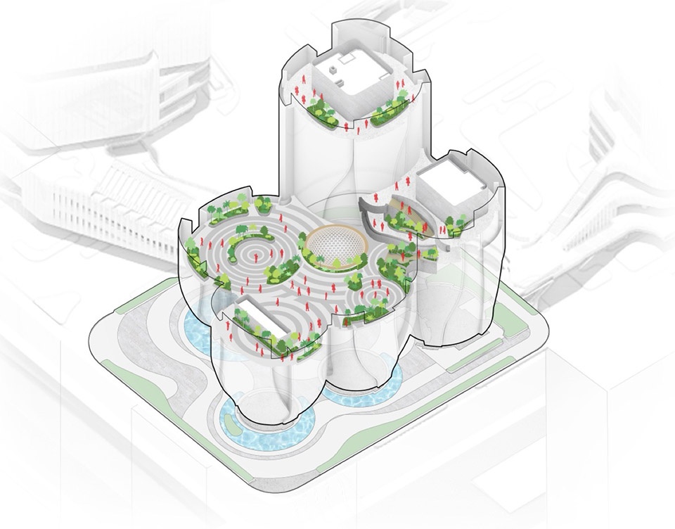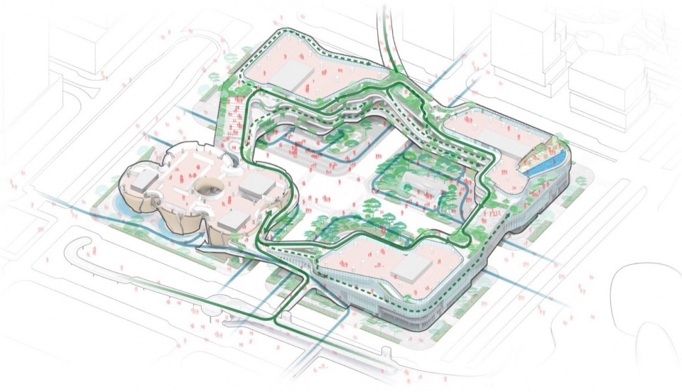 ▼环绕着中央绿洲的三维步道,3-dimensional promenade around the central oasis