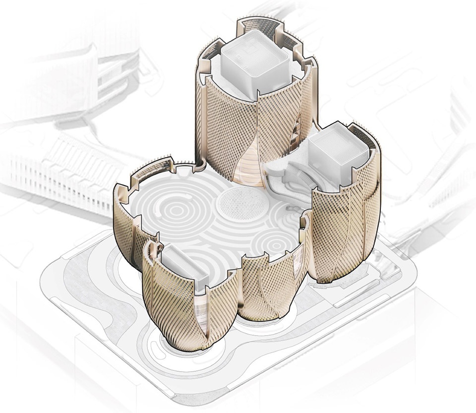 The museum’s façades consist of a system of horizontal layers that step backwards to form the organic cone shapes of the building. These are further enveloped by an outer layer of parametrically engineered suspended glass tubes that create a translucent veil around the volumes.