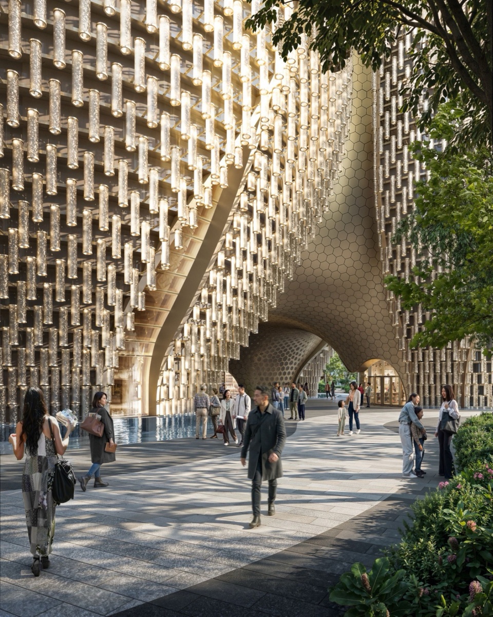 海绵城市”的整体水管理策略。白天,玻璃管捕捉自然光;夜晚,在灯光照明下柔和发亮,形成如织物般的视觉效果,具有丰富的触感层次与有机质感,使其在密集的深圳天际线中清晰可辨。