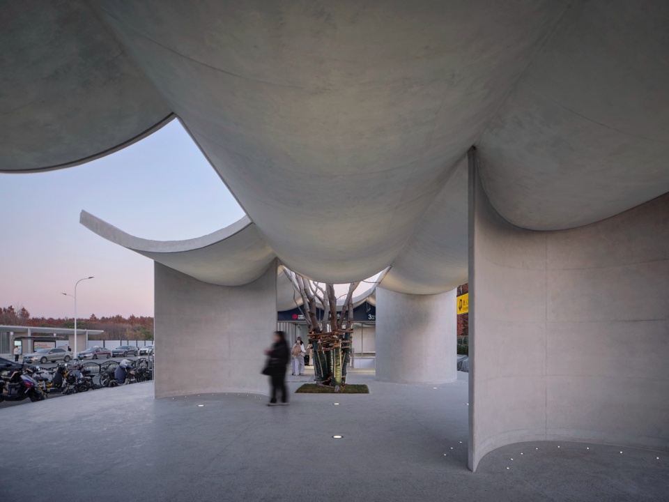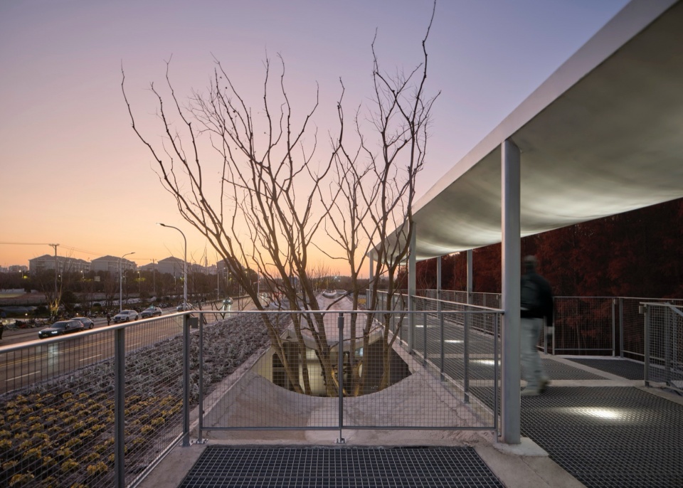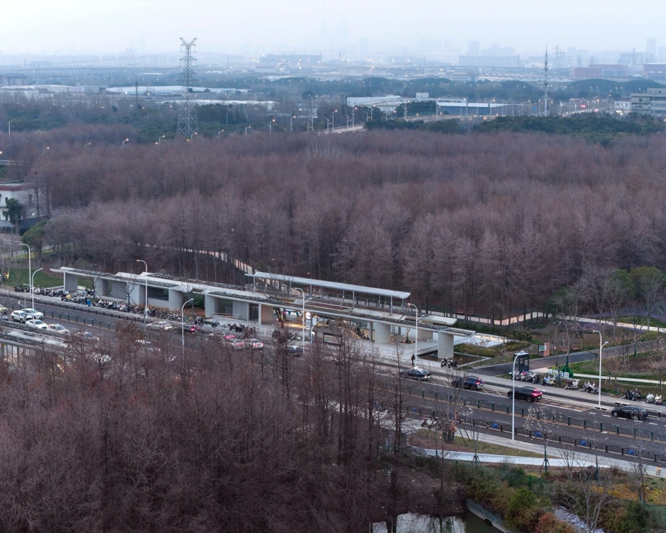 East Kangqiao Station is situated in the southern part of Zhangjiang Science City of ShangHai, at the heart of the Outer Ring Ecological Corridor, with the green belt of the Hengmian area immediately to its north. The site is embedded in a natural setting of dense waterways, fields, and woodland. Guided by the concept of “Emerging from the Wetland,” the design allows the above-ground station to grow out of the natural fabric of the Hengmian wetland, coupling urban development with natural habitat and creating a boundless station where city and landscape merge.