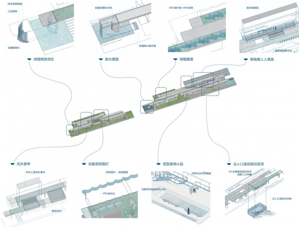 水渠也作为形态原型被纳入空间营造。主要出入口与风井、安全出口等设施通过弧形单元相互衔接,形成连续的景观界面,形成连续的景观场域;孤立的风亭组、冷却塔等设施,则通过弧形绿植界面围合,与游廊、景观亭及停留节点复合设置,演绎为湿地中的景观小品。不同组团单元的开口方向、界面转折与屋面高低变化均与周边路径、水系及视线关系相呼应,游人可自然接入湿地与城市的双重空间脉络,营造出“站在景中,景融于站”的意境。