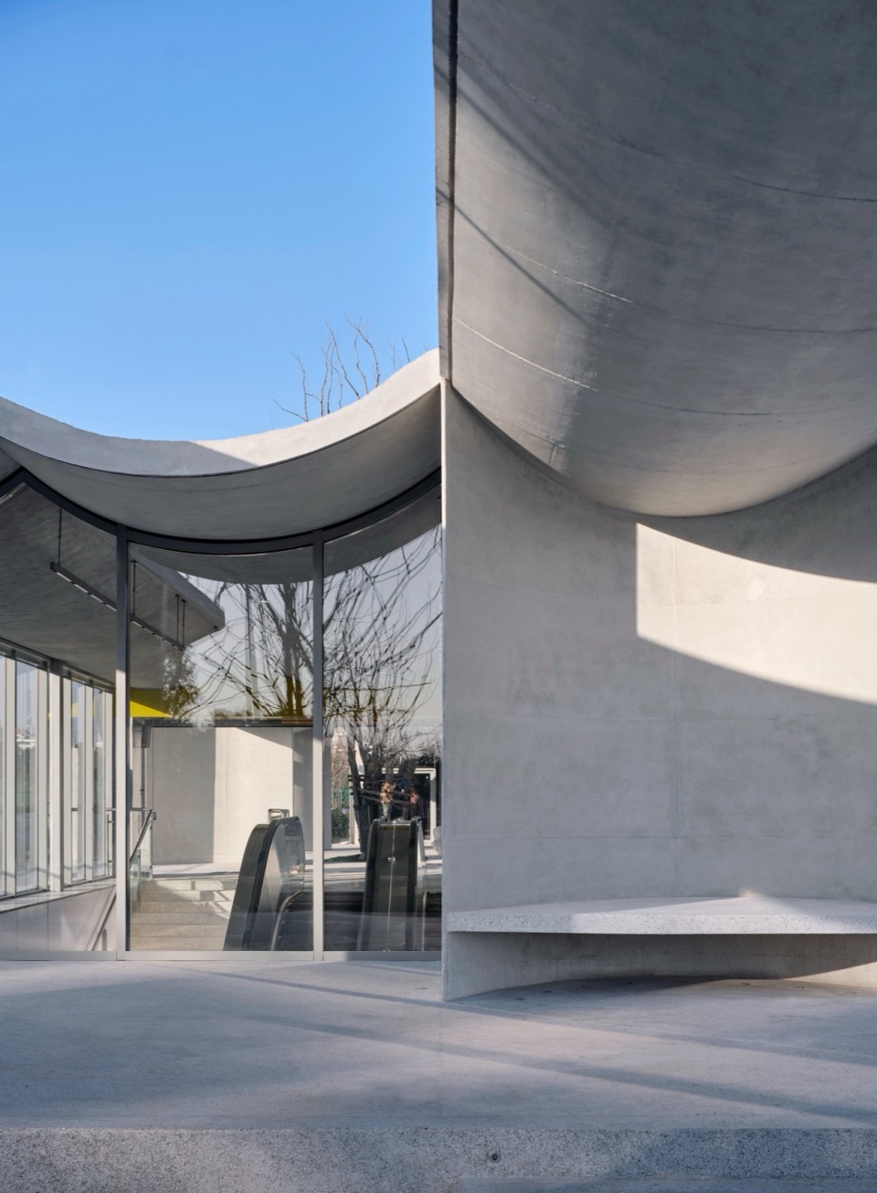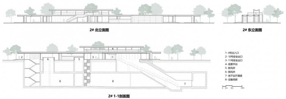 Water canals are also taken as formal prototypes in the making of space. The main entrances are linked with ventilation shafts and emergency exits by means of arched modular elements, creating continuous landscape interfaces and spatial fields. Isolated ventilation structures and the cooling tower are enclosed by curved planted interfaces and integrated with corridors, garden pavilions, and pause points, transforming them into landscape features within the wetland. The orientation of openings, the turns of the interfaces, and variations in roof height all respond to surrounding paths, waterways, and sightlines, allowing visitors to move naturally between the wetland and the city.