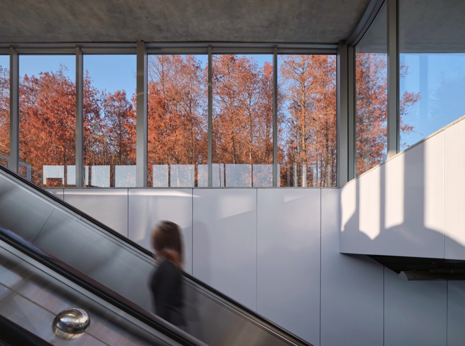 ▼出站即林海,扶梯沐秋色,Stepping out into the woodland, escalators bathed in autumn light.