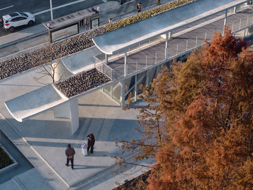 In terms of landscape experience, the design choreographs the surrounding scenery through a looping sequence of movement, allowing the wild charm of the wetland to intertwine with urban life. Continuous outdoor eaves not only provide shade and shelter for daily commuters, but also serve as public leisure spaces within the wetland park. Spaces beneath the eaves, vertical greenery, viewing platforms, and steps descending toward the water create a natural transition between station and park. From the roof, visitors can look out across the wetland from above the treetops, taking in the full panorama of the city and woodland beyond.