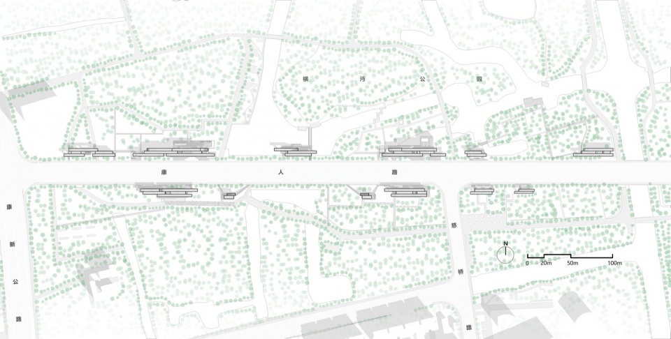 然而,为服务地下线性轨交工程,站点及附属设施沿康人路两侧线性散布,形成近700米长的工程带,犹如嵌入绿色生态基底的“灰色斑块”,加剧了城市建成区与自然生态区之间的边界对立。同时,传统轨交站点地面设施多强调效率与速度,形式往往硬质粗放,成为镶嵌于自然中的“标准符号”,带来空间切割、边界强化与环境异质性等一系列问题。