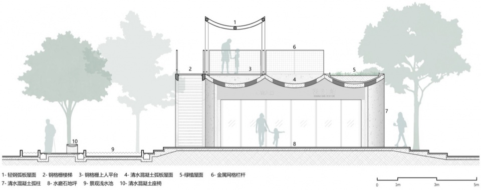 弧形单元横向生成站厅出入口、游廊、长亭、浮桥等空间,纵向则作为支撑结构与绿植载体;部分屋面抬升形成可上人的景观屋面,部分则配置绿化屋面,与湿地景观自然衔接。4处屋面结合地面水池暗藏循环跌水装置,可按需启用形成轻缓瀑流景观,勾勒出“水从檐落,亭浮于沔” 的诗意画面。