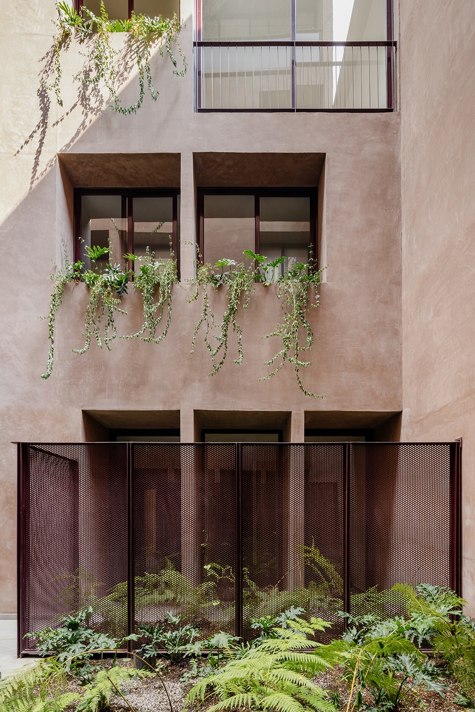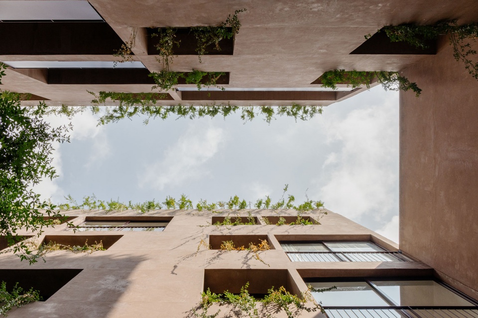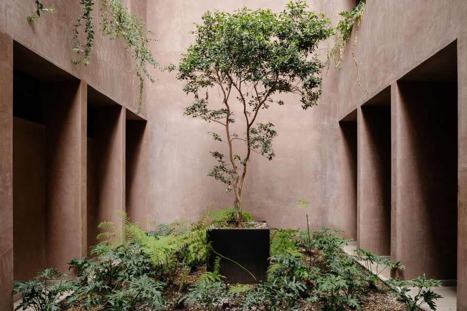 这种内部逻辑在主立面上以垂直节奏得以表达,通过窗洞与种植槽的交替排列,与人行道旁的蓝花楹树形成对话。