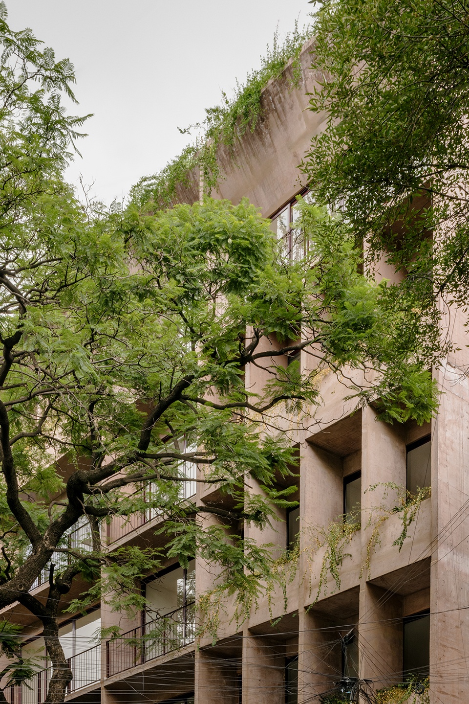 This internal logic is expressed on the main façade through a vertical rhythm that alternates windows and planters, in dialogue with the jacaranda tree along the sidewalk.