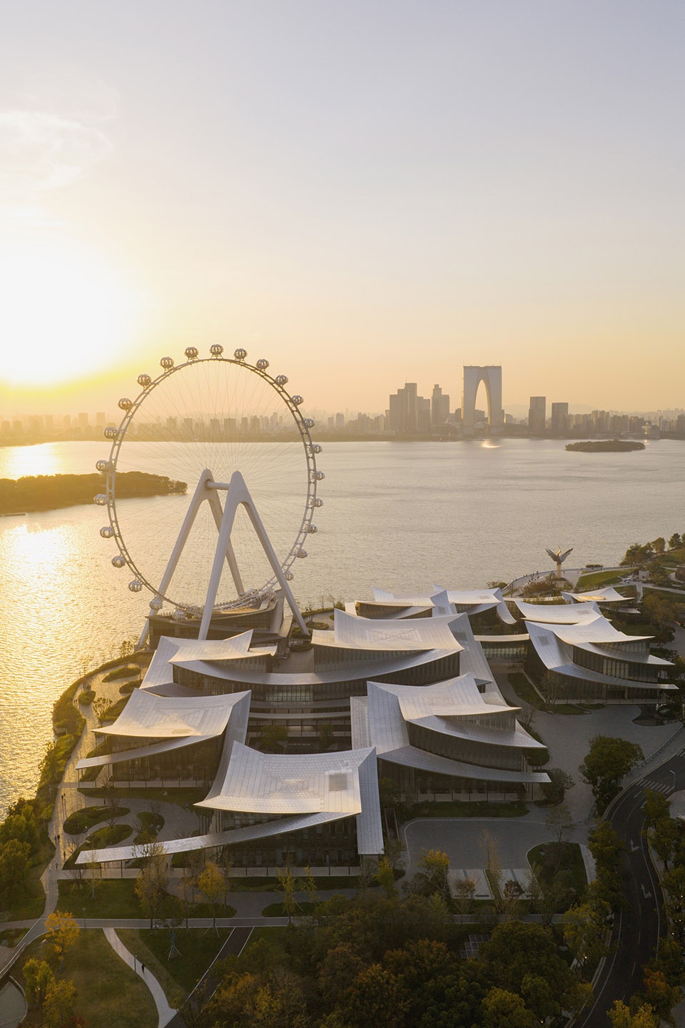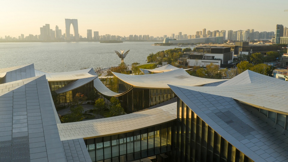 苏州当代美术馆雄踞于金鸡湖右岸滨湖公园带的核心腹地,不仅是金鸡湖畔重要的文化节点,更是连接苏州古典文脉与未来城市愿景的战略性地标。项目由国际顶级建筑事务所BIG (Bjarke Ingels Group) 担纲建筑设计,其景观设计旨在继承与延续苏州园林精神,用当代的景观语言创造建筑与自然的无界融合,赋予当下城市生活一种全新的自然文化体验。