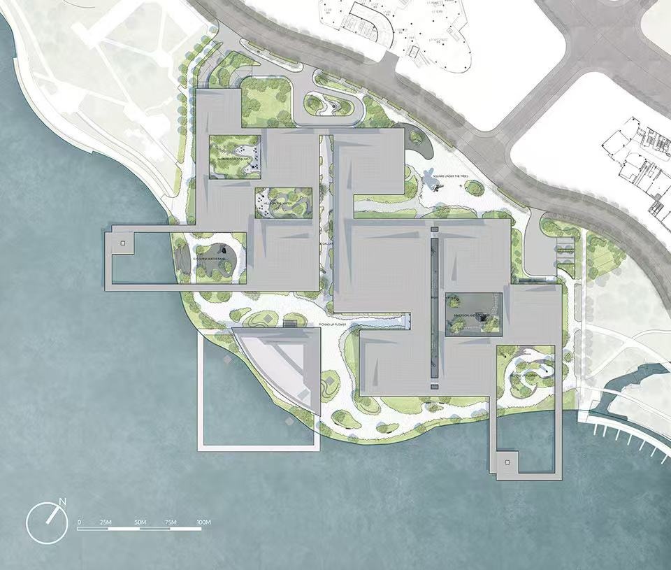 As the founder of BIG described the experience of wandering through the space: one moment you are immersed in the artistic imagery of the exhibition halls, the next you stroll through the courtyards feeling the lake breeze on your face, and then you climb to a high place to overlook the undulating urban skyline. This transformation of body and mind, and the progression of scenery, perfectly align with the three essential principles of gardens summarized by Tong Jun in The Gardens of Jiangnan: “Well-proportioned density, exquisite twists and turns, and captivating views at every glance”.