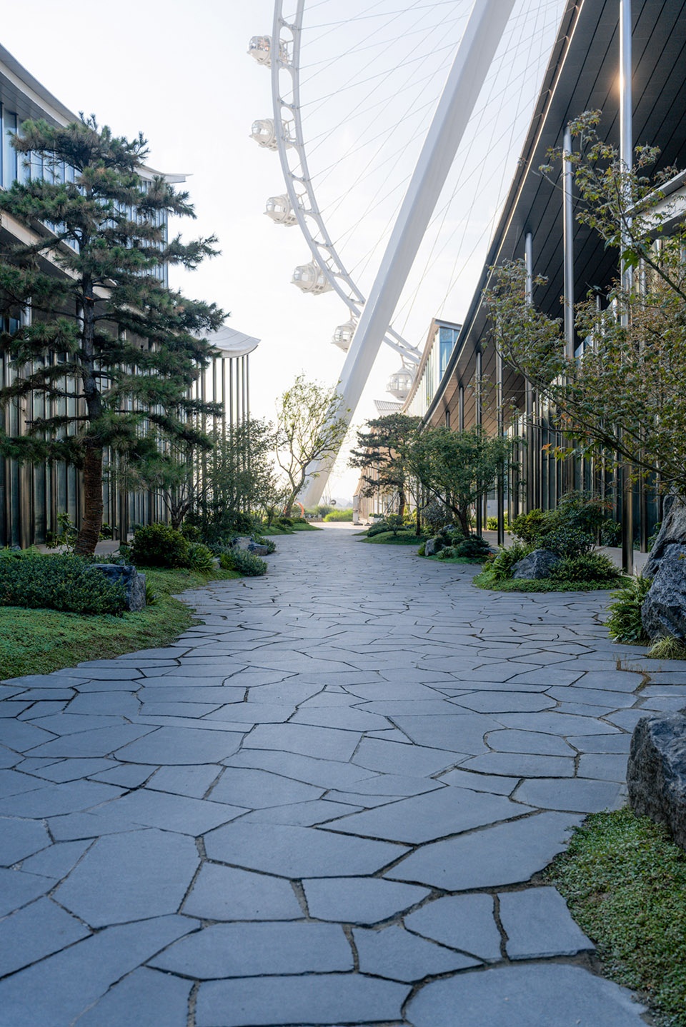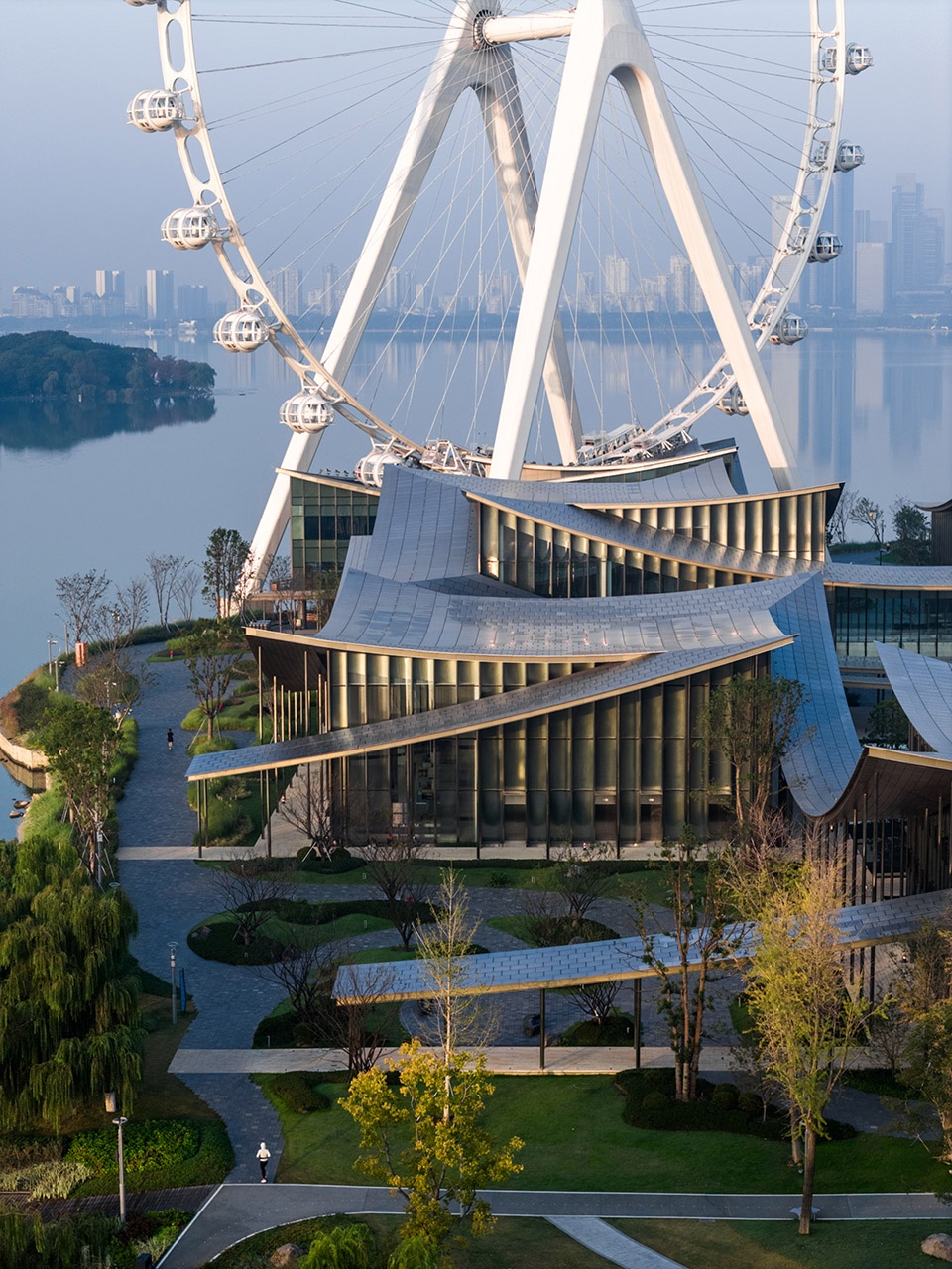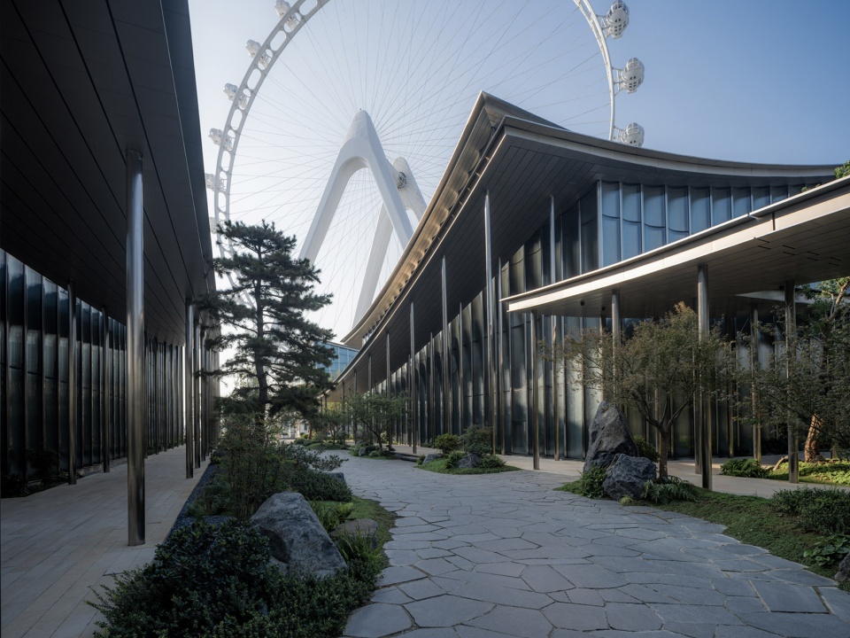 景观将传统山水意象解构、抽象、重构——让巨大的公共建筑不再以体量凌驾于自然之上,而是悄然消隐于山水语境之中。于是,当代的钢铁骨架与古典的山水精神在此相遇,开启一场跨越千年的对话:一边是前卫的构造逻辑,一边是本真的自然哲思。