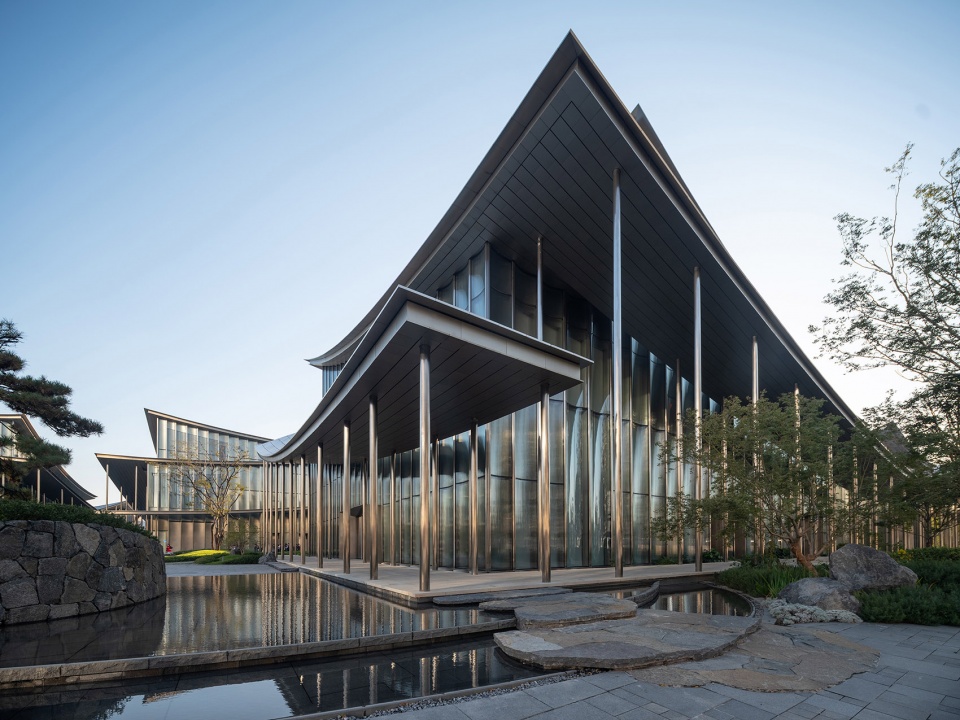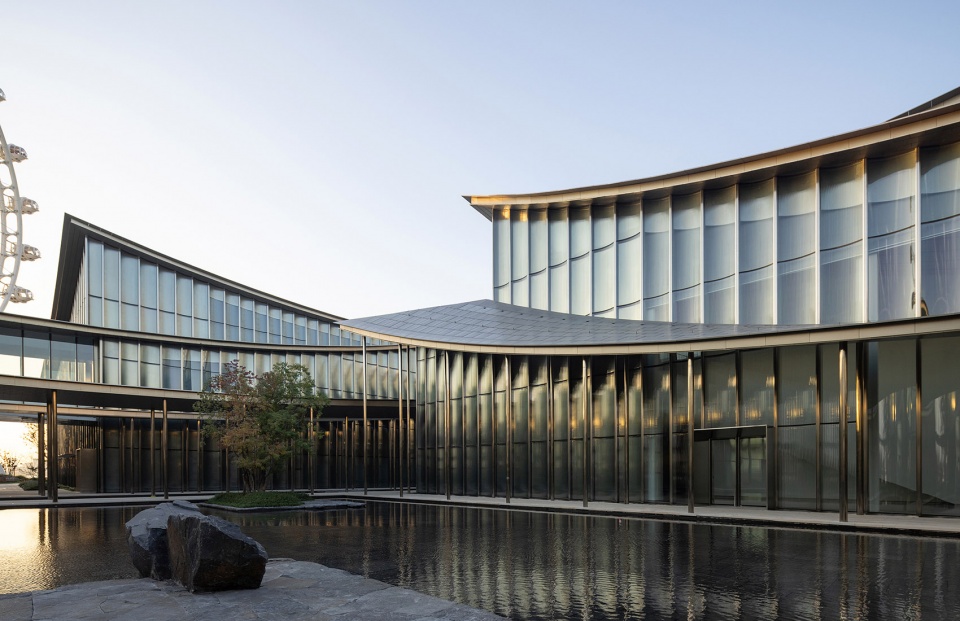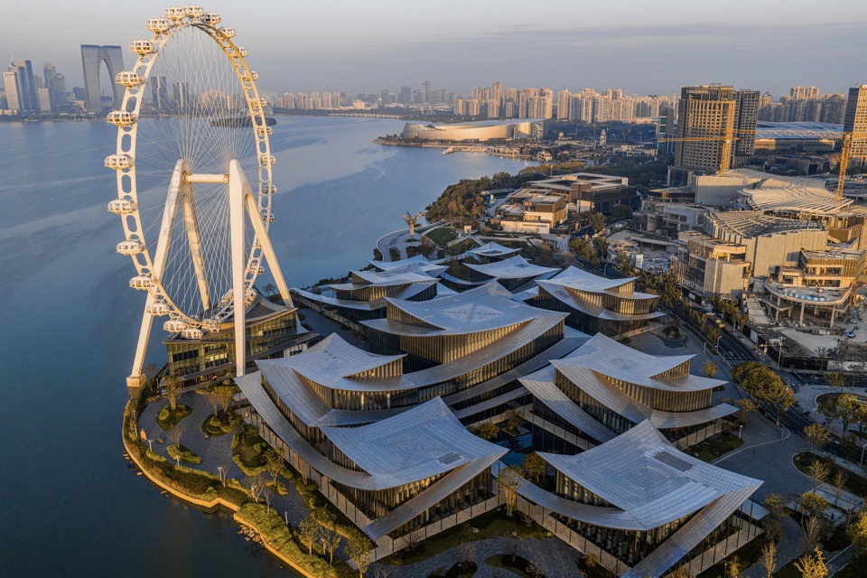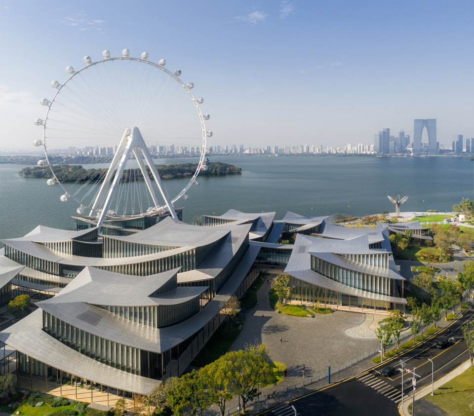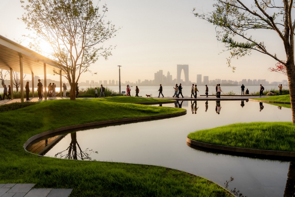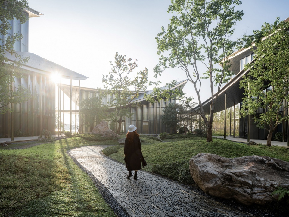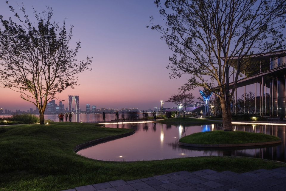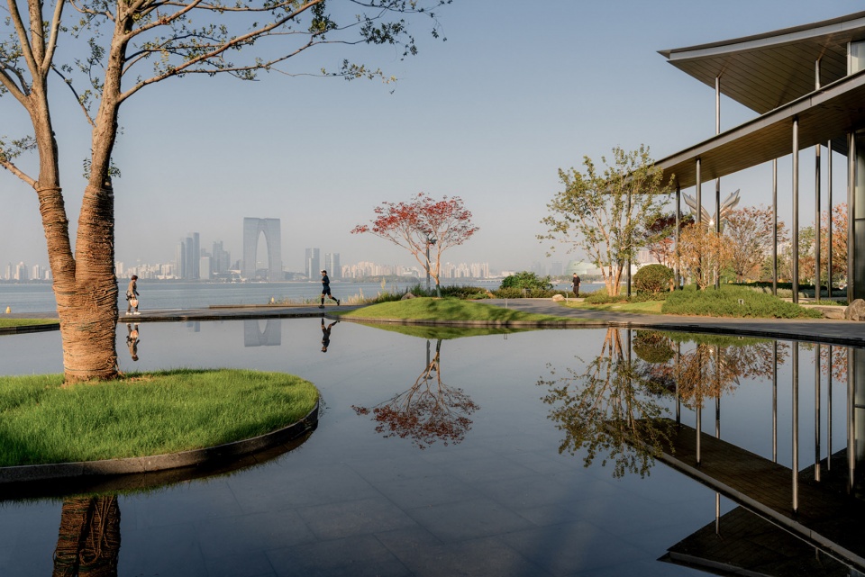 水天一色的景观格局,将金鸡湖湖面及对岸城市天际线尽收眼底;水榭处回望,建筑掩映于自然绿植之中,与水中倒影形成虚实相映的景观效果,实现建筑、自然与城市的共生共荣。
