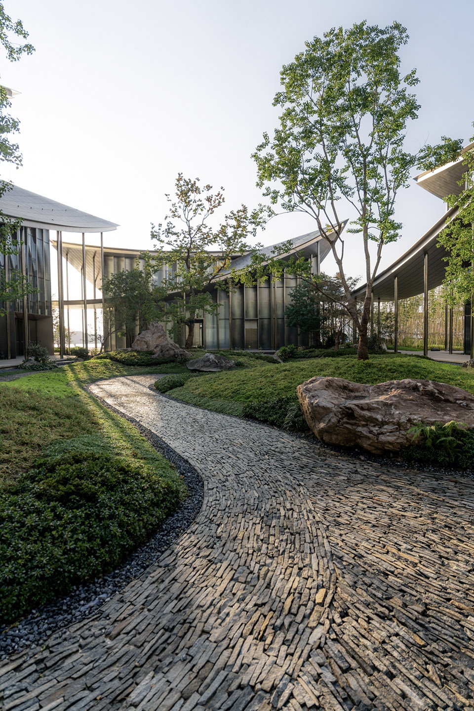 The winding flagstone paving mimics the stretching texture of shimmering water ripples, the undulating green valleys echo the texture strokes of landscape paintings, and the scattered mountain stones create negative space in the layout. Skylight filters through the branches and leaves, casting rich layers of light and shadow on the walls, blending the artistic conception of mountains and rivers with modern architectural space.