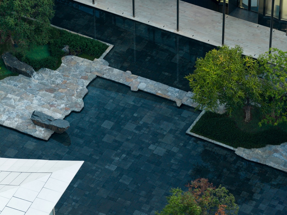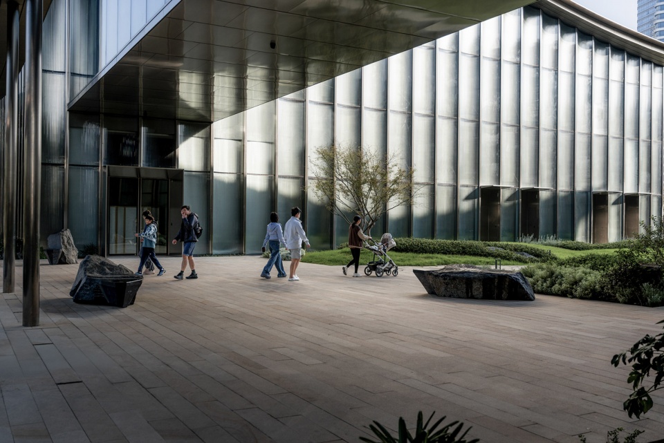 Water and stone form a striking contrast with the iconic modern materials of the building—the coldness of steel and the transparency of glass—yet achieve a delicate harmony with them. Like a pair of tacit dancers, they blend hardness and softness, virtual and real, jointly weaving a contemporary yet oriental landscape scroll, frozen as a moment of warmth where time, light and shadow intersect.